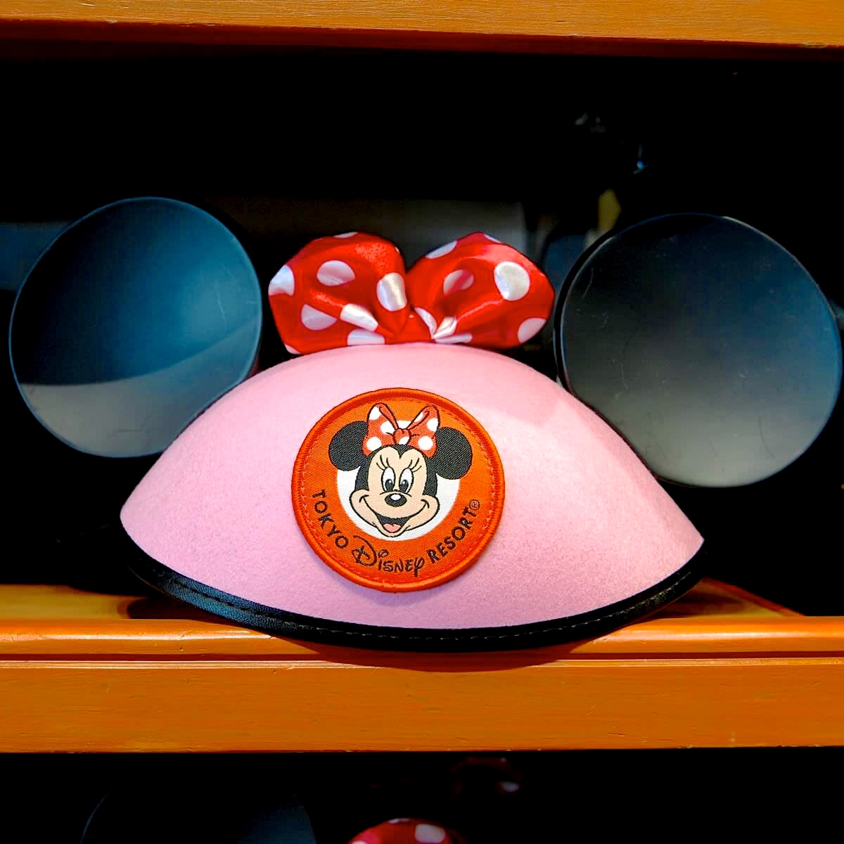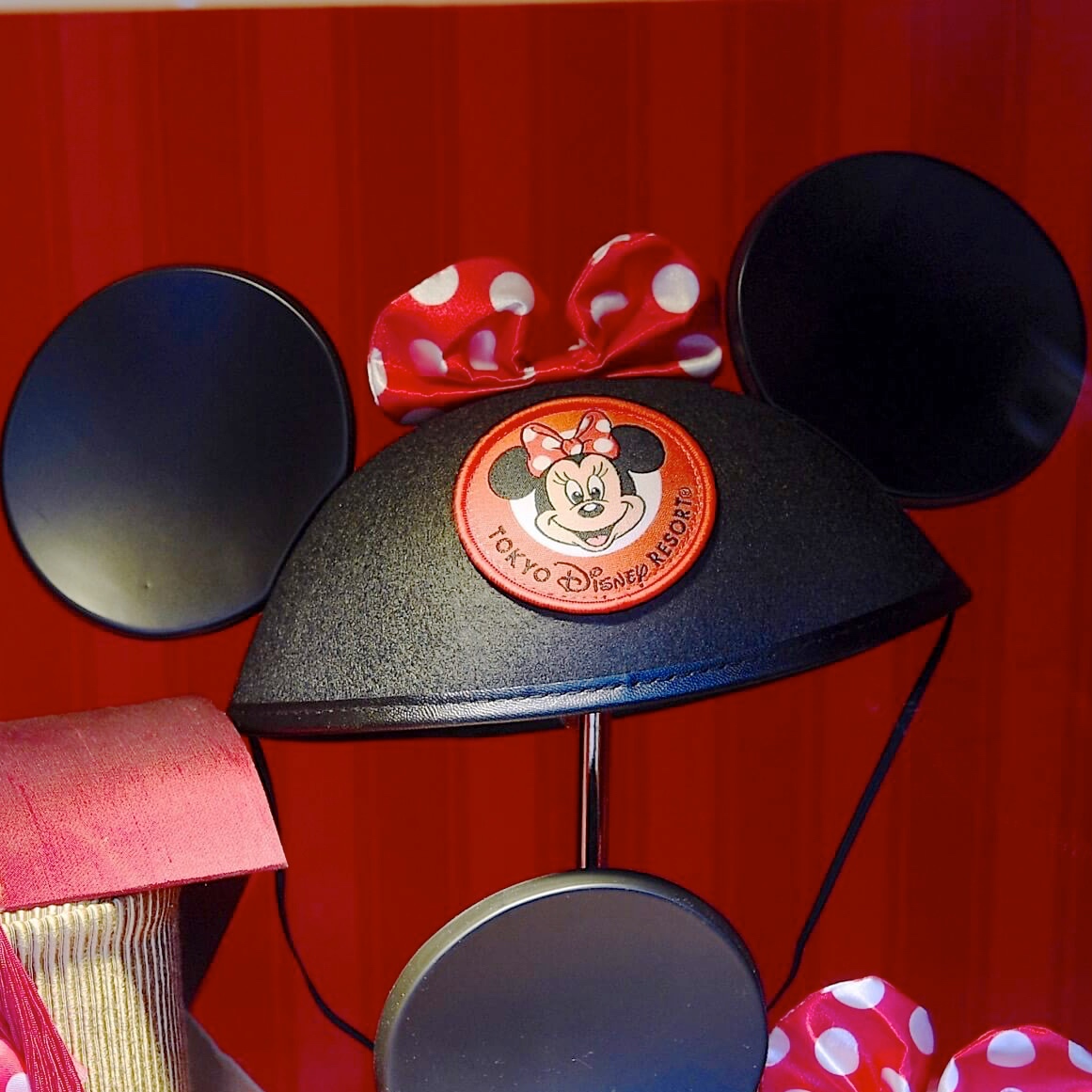 赤に白のドット柄リボンがついたミニーマウスデザインのイヤーハット。
