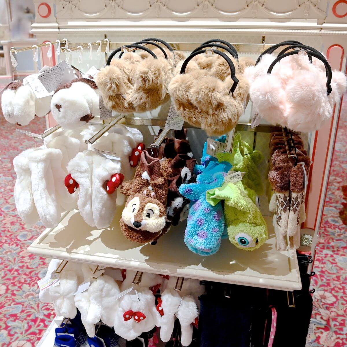 お洋服にあわせやすいピンクとベージュのミッキーイヤーマッフルやマカロンデザインのイヤーマッフル、『カーズ』のイヤーマッフルが販売中です☆