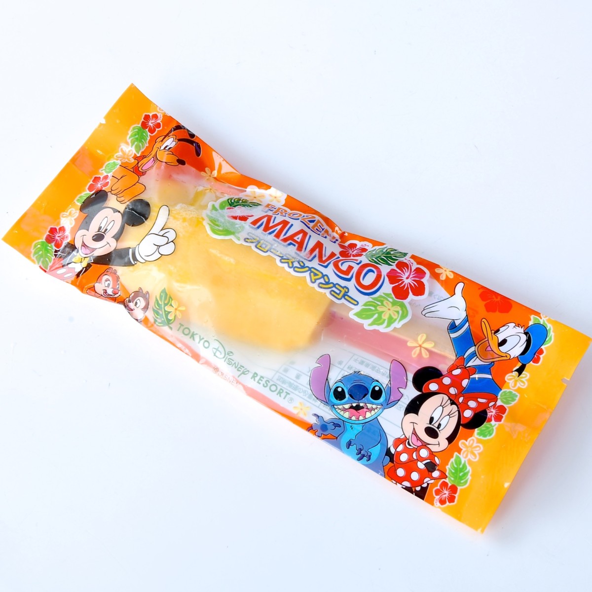 ミッキー、ミニー、ドナルド、プルート、チップ、デール、スティッチがデザインされたトロピカルな雰囲気のパッケージにはいったフローズンマンゴー。