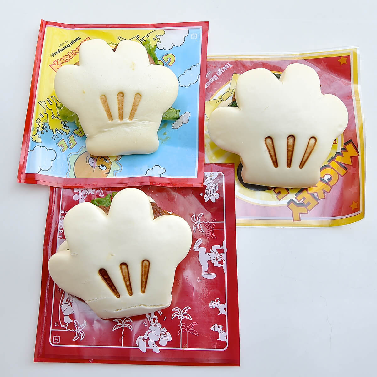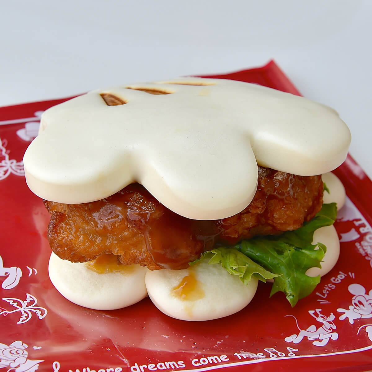 ミッキーのアイコンである真っ白なグローブ(手袋)の形をしたパオ(パンズ)にサンドされた「グローブシェイプパオ」