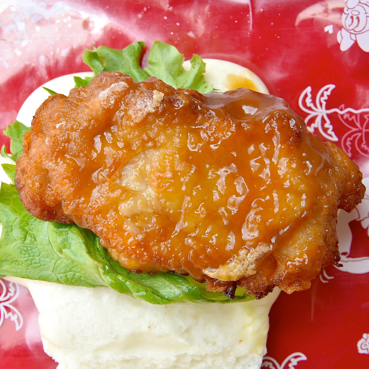 もっちりとして、少し甘めのグローブシェイプのパオ(パンズ)にサンドされた揚げたてジューシーなチキン。