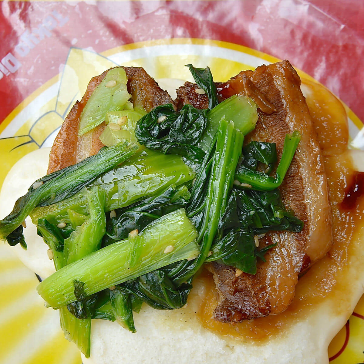 たっぷりの豚の角煮と青菜をパオ(パンズ)でサンド。