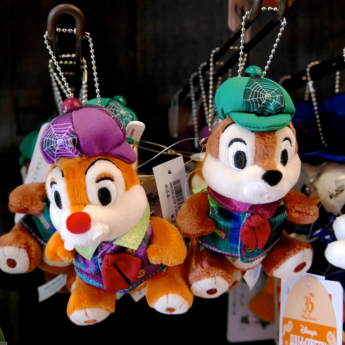 チップとデールは蜘蛛の巣やジャック・オー・ランタンがデザインされた緑と紫のコスチュームからゴースト風コスチュームに変身。