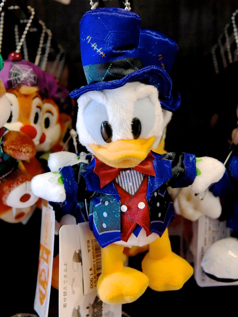 ドナルドは赤のベスト、蝶ネクタイがおしゃれなコスチュームからゴースト風コスチュームに。