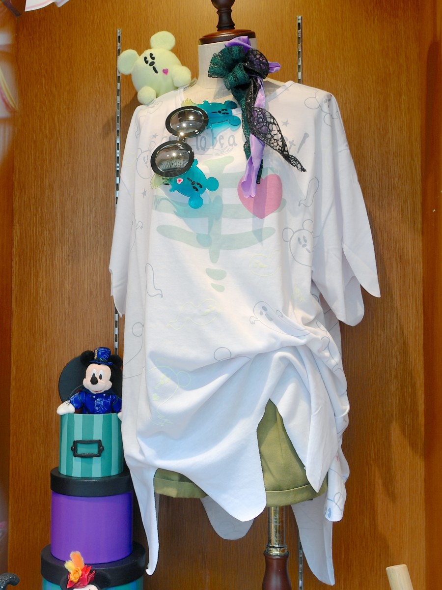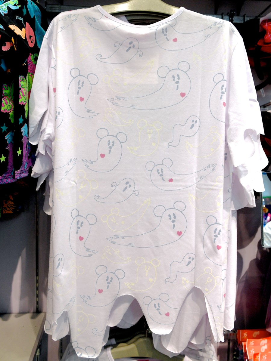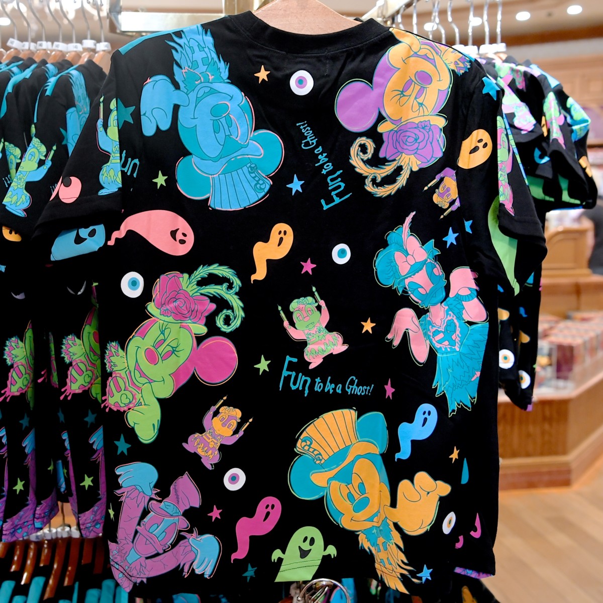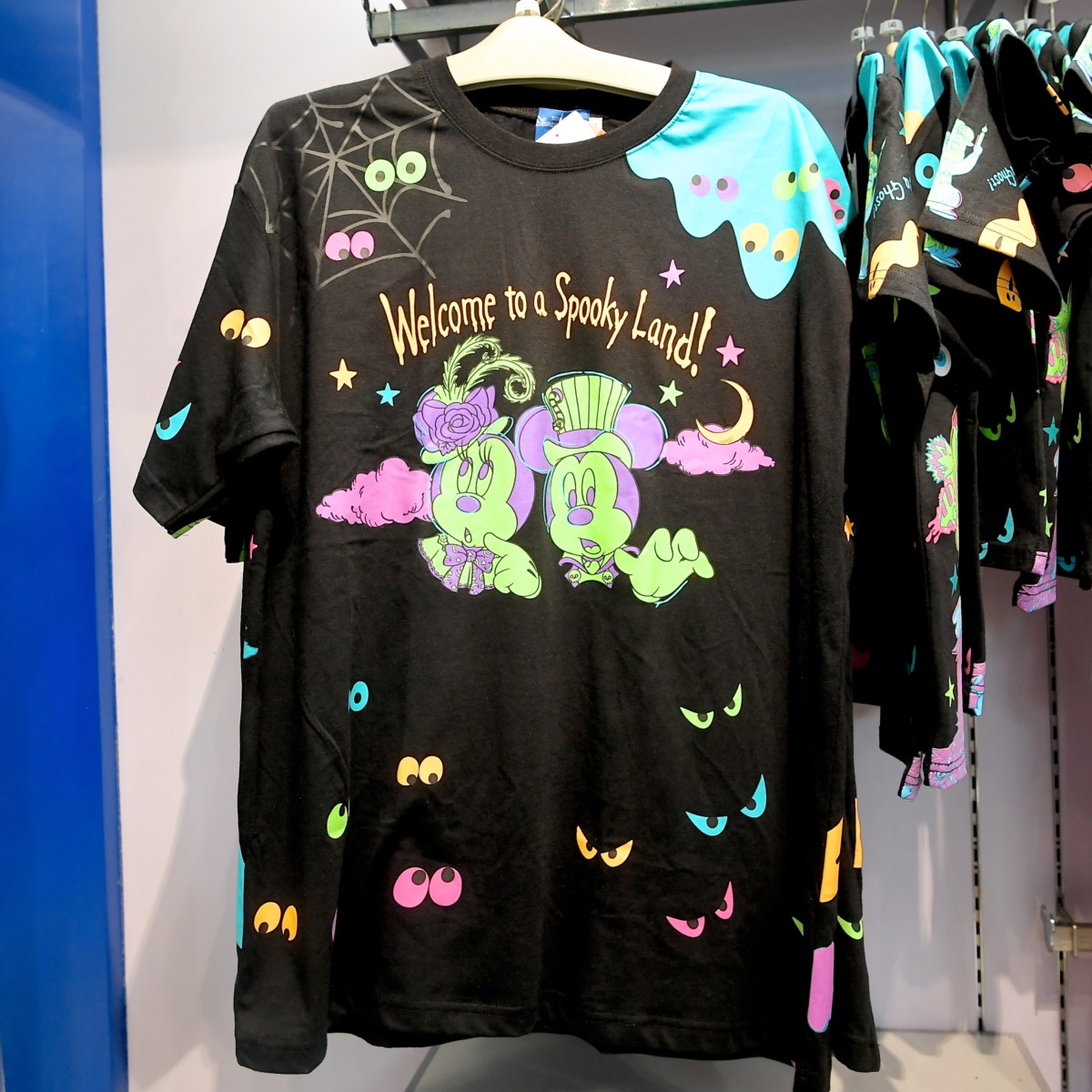 「スプーキー"Boo!"パレード」コスチュームのミッキー、ミニー、おばけたちの目がデザインされたカラフルなTシャツ。