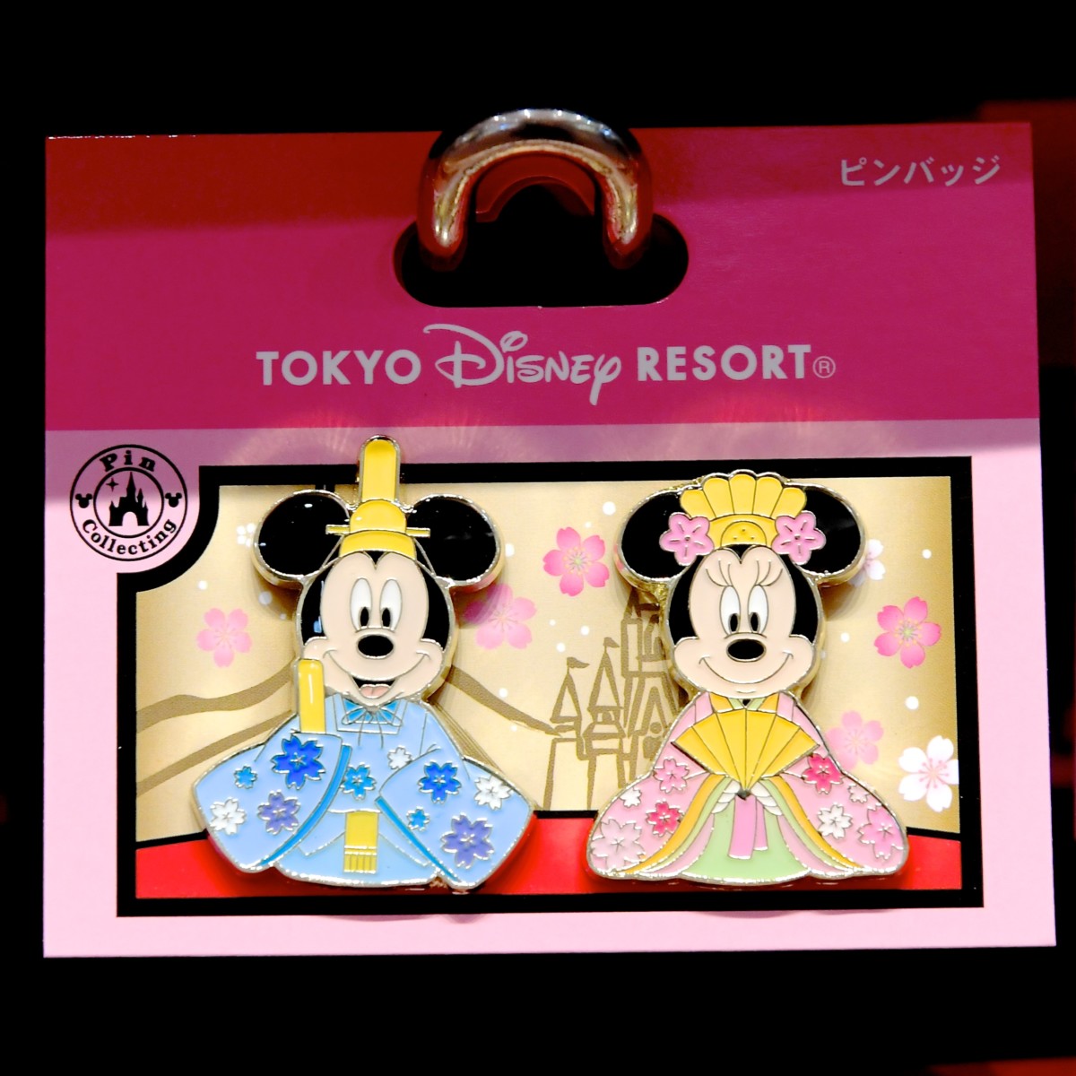 シンデレラ城やプロメテウス火山が描かれた屏風デザインの台紙にセットされたお内裏様ミッキーとお雛様ミニーちゃんのピンバッジセット。