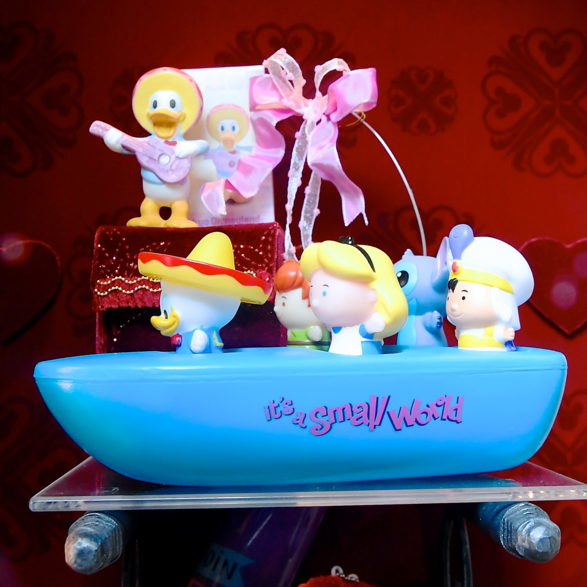 イッツ・ア・スモールワールドのボートに搭乗しているドナルド、ピーター・パン、アリス、スティッチ、アラジンのおもちゃ☆