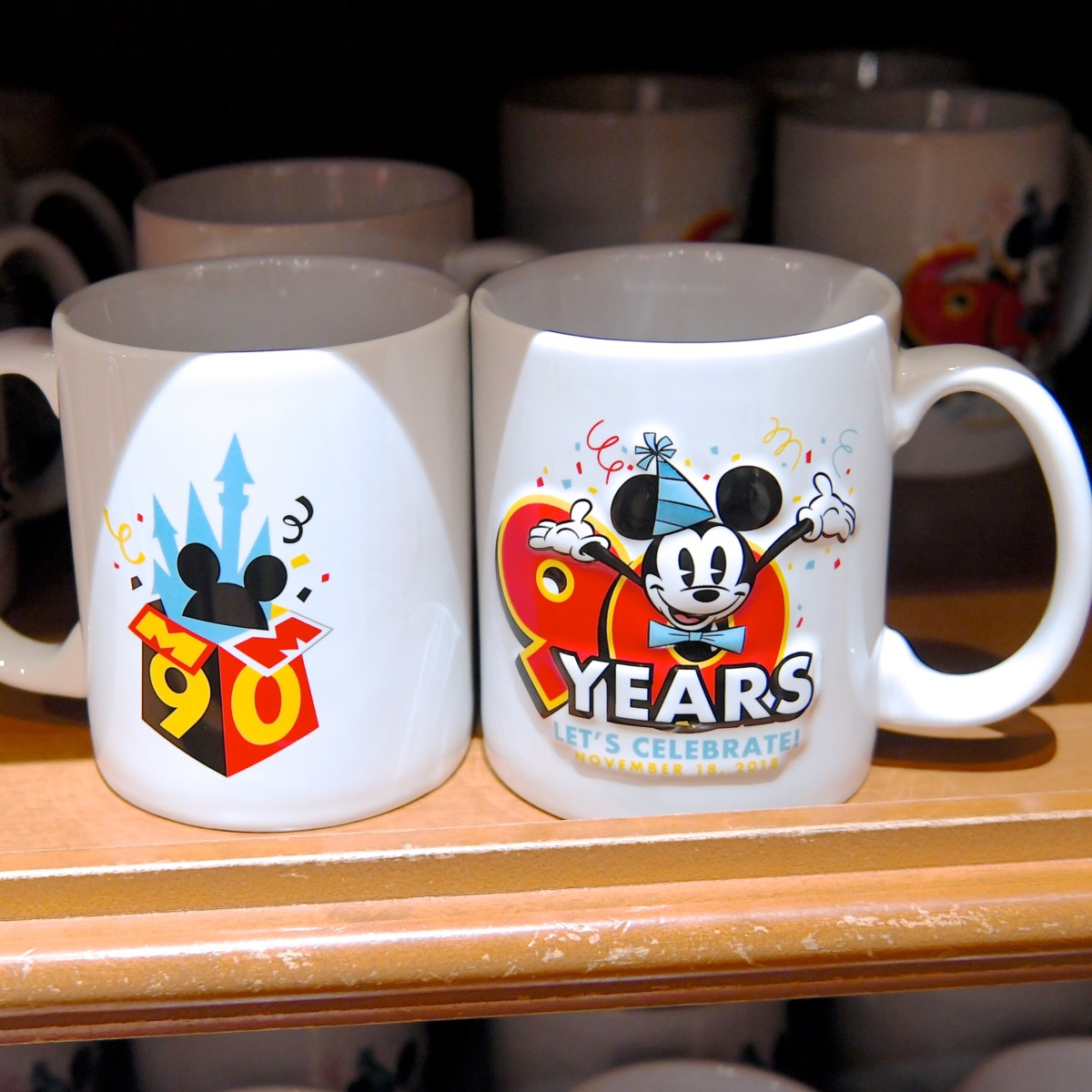 マグカップの前面は90のロゴから飛び出したミッキー、