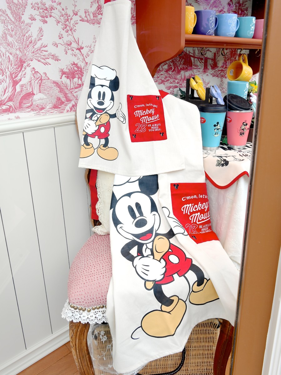 今回はシェフ姿のミッキーがデザインされたエプロン、キッズエプロン、ランチョンマットを紹介します。