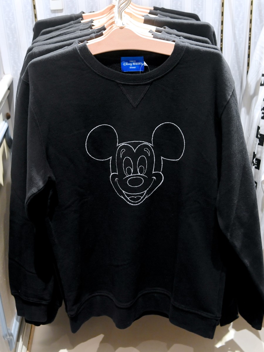 秋冬ファッションに合わせやすいクールなブラックにミッキーのお顔がデザインされたトレーナー。