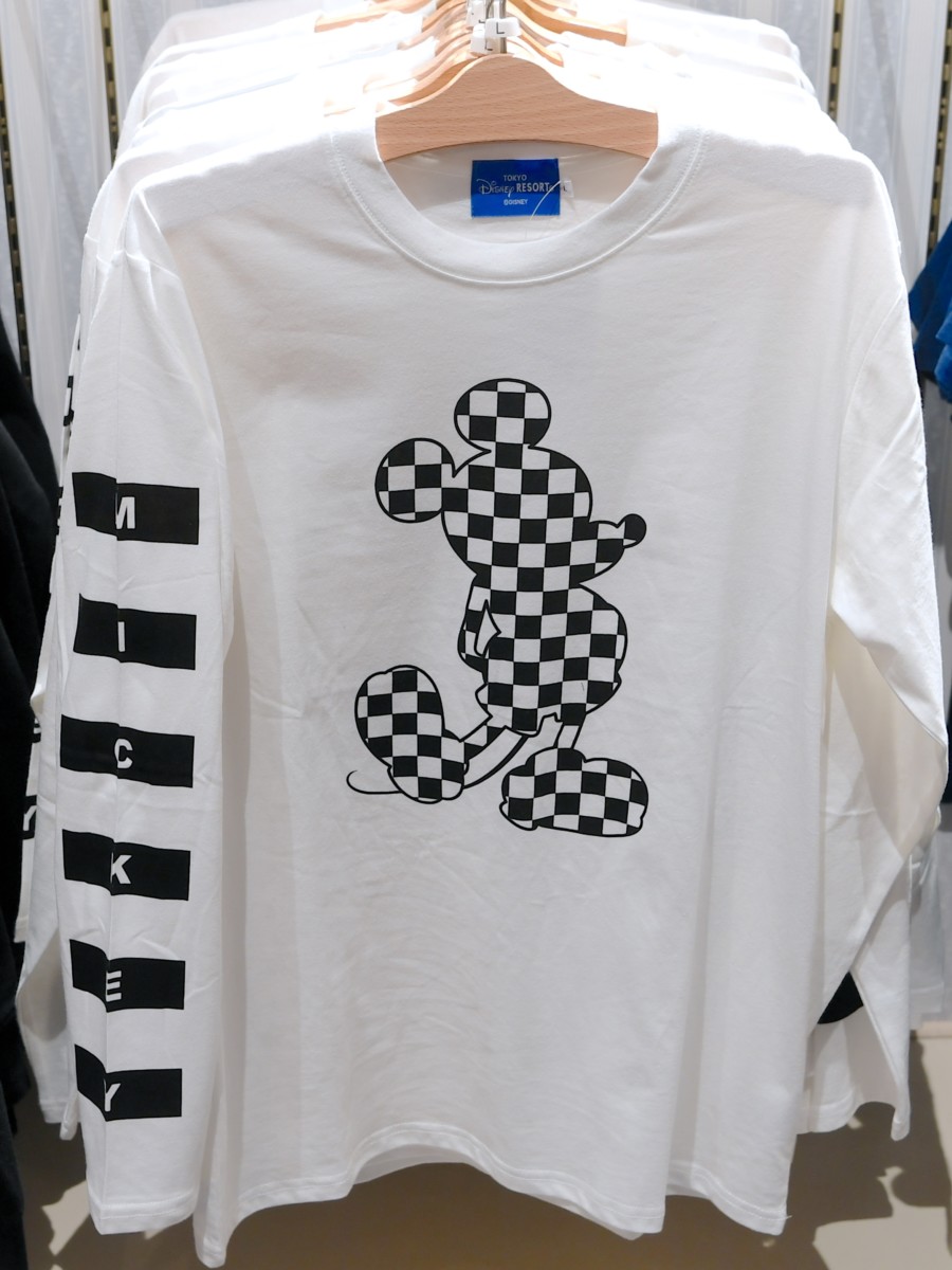 白Tシャツに黒白のミッキーシルエットがデザインされたロングTシャツ。