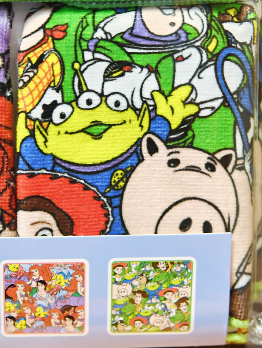 『トイ・ストーリー』のキャラクターたちがデザインされたミニタオルは緑。