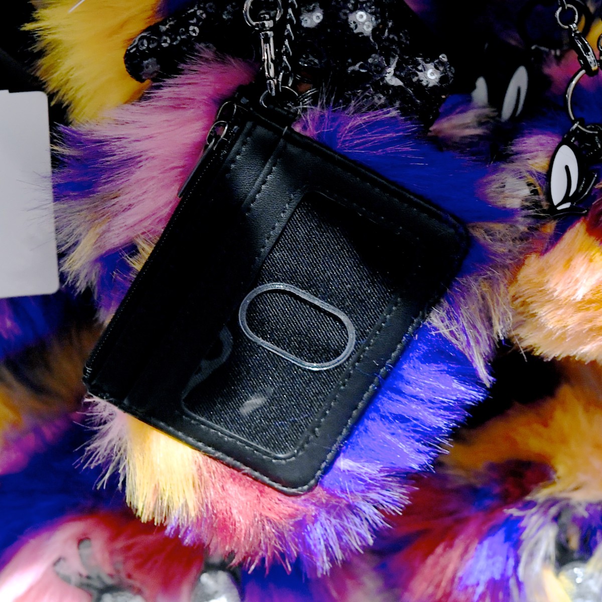 ブラック×グレーのミニーちゃんファーポーチ。