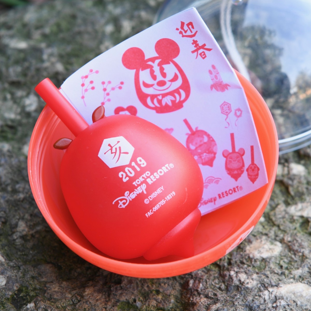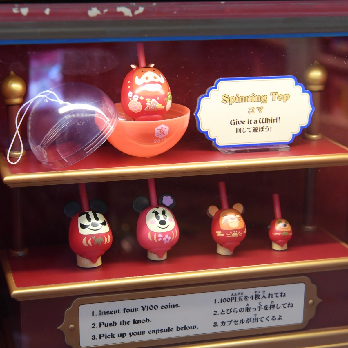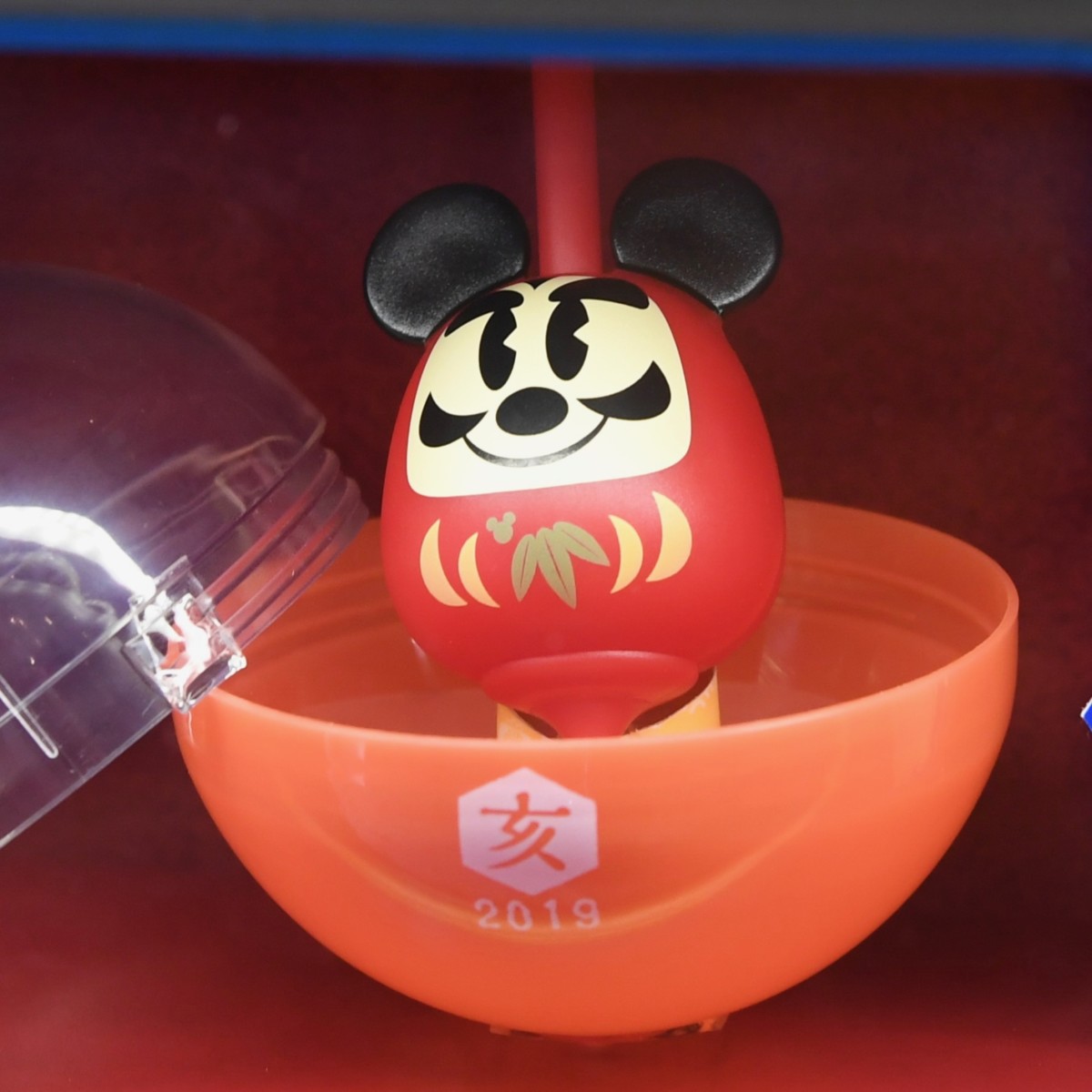 東京ディズニーランドのお正月デザインカプセルトイはおめでたいダルマデザインのコマ。