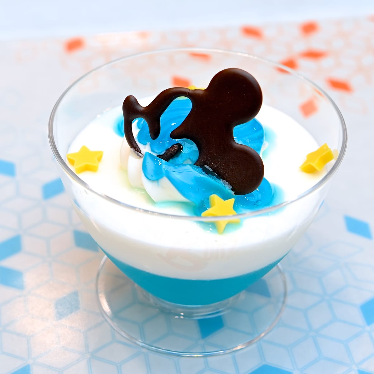 宇宙のような青とお星様形の黄色いチョコがトッピングされたカップデザート。
