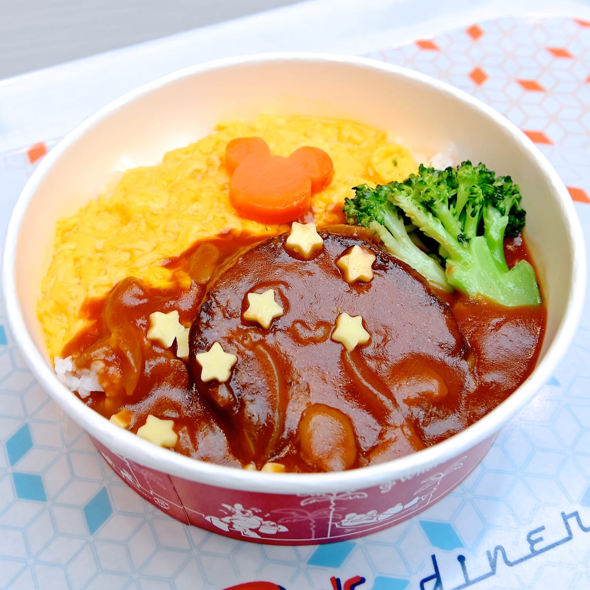 宇宙をイメージしたお星様型のチーズがトッピングされたハンバーグとオムライスがセットで楽しめるライスボウル(どんぶり)