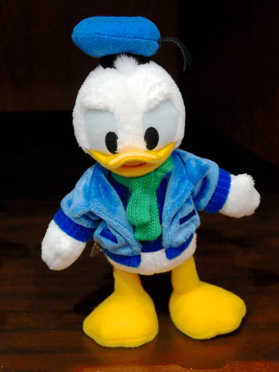 セーラー帽、ニットマフラー、ブルーのジャンパーをきたドナルドのポージープラッシー。
