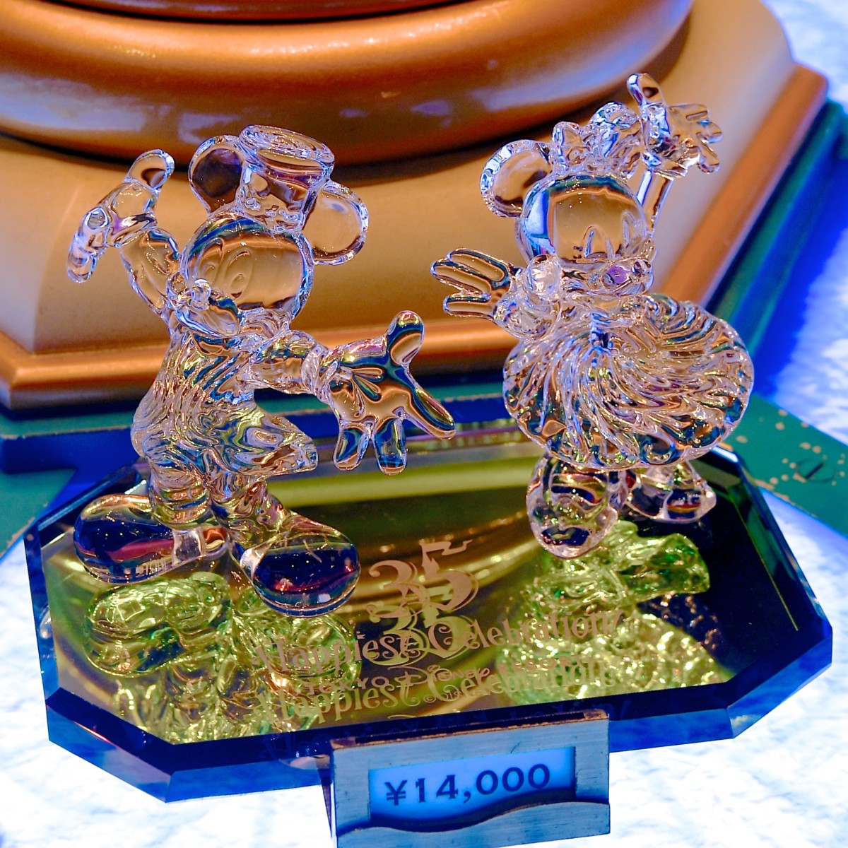 35HappiestCelebration!と描かれたカラフルな台座に35周年コスチュームのミッキーとミニーがデザインされたフィギュアリン。