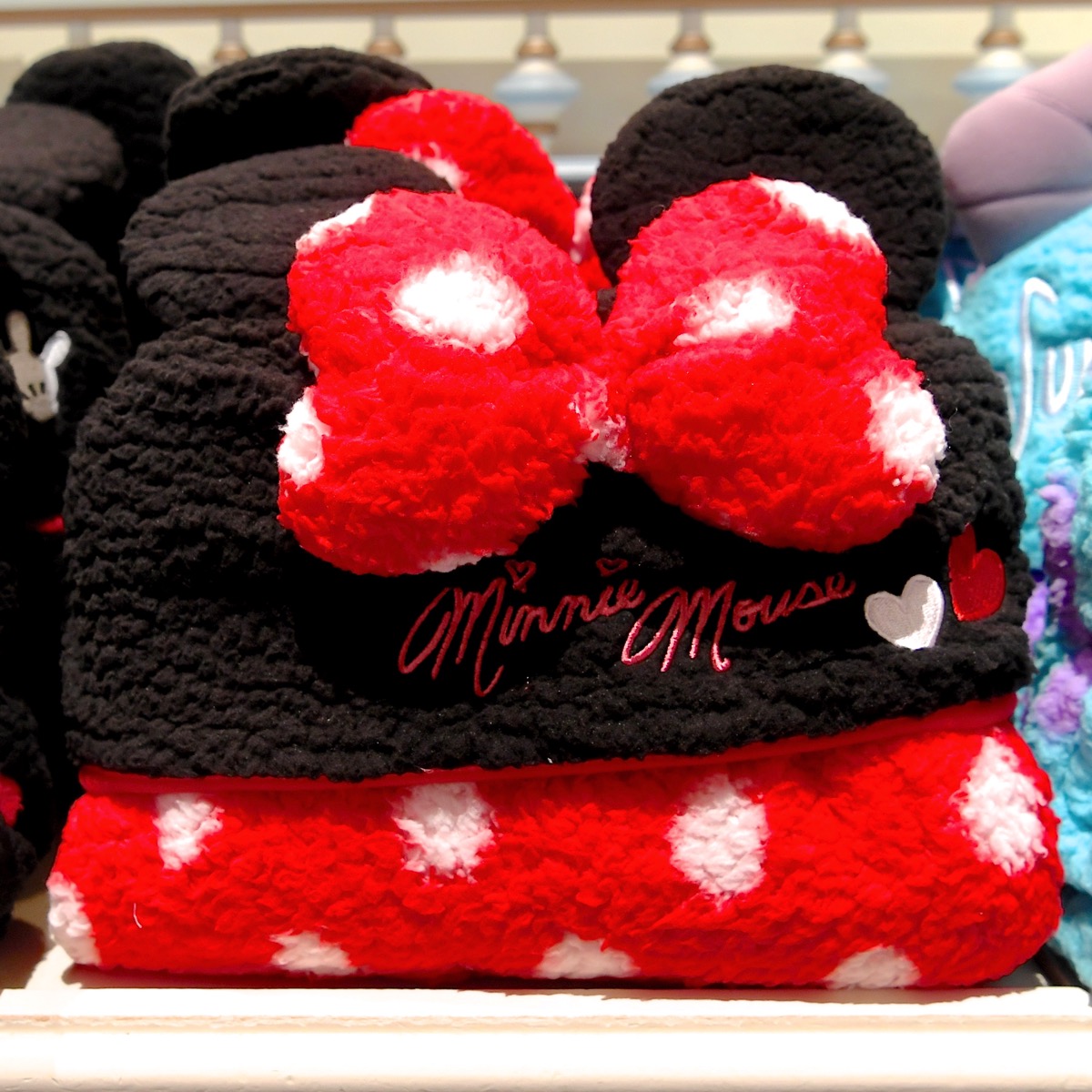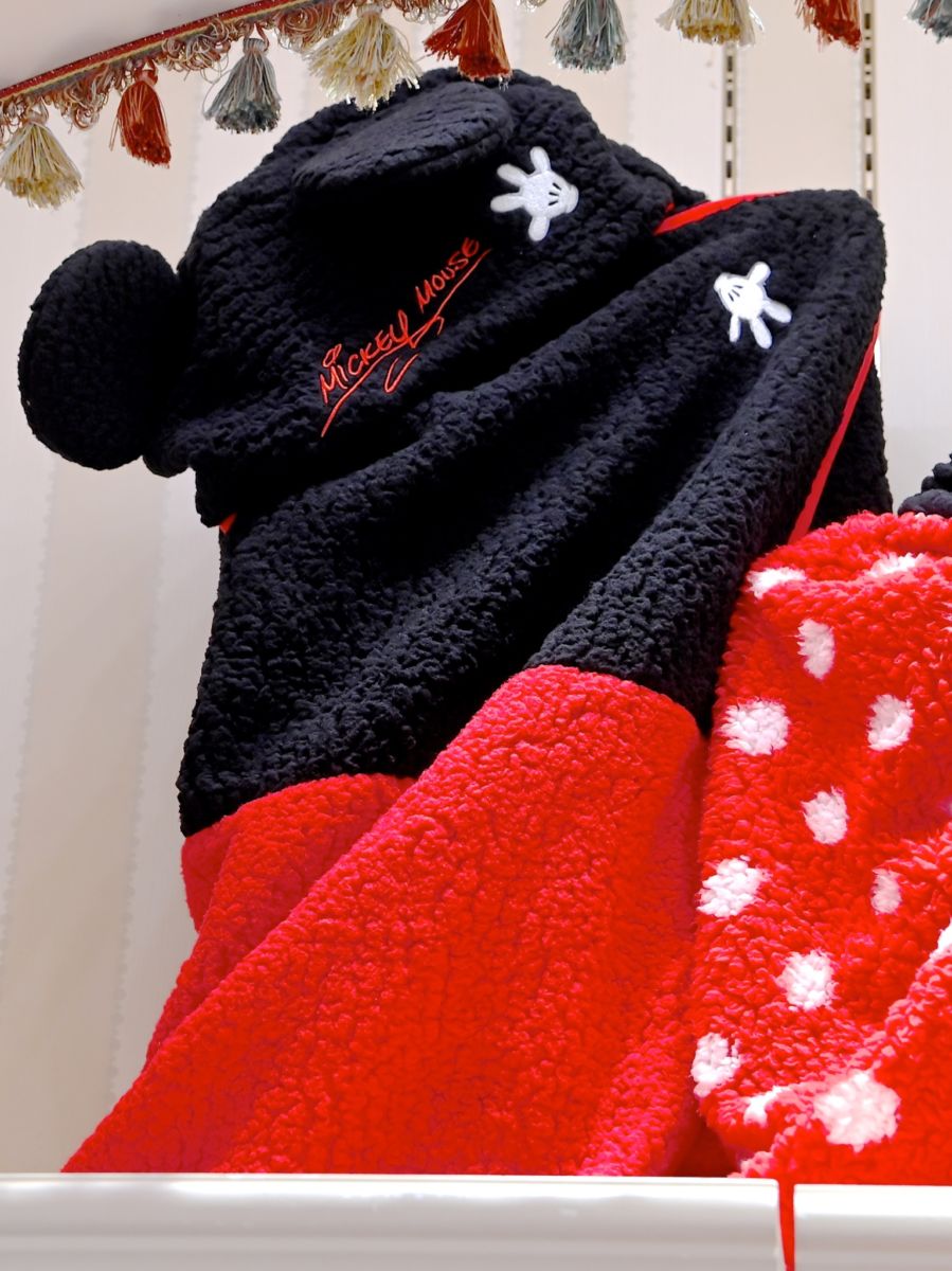 定番ミニーマウスのフード付きブランケット。