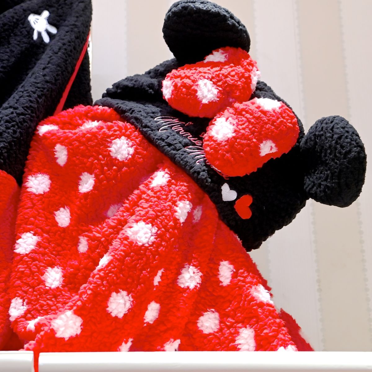 フードにはお耳と大きなドット柄リボン、ミニーマウスのサイン、ハートがデザインされています。