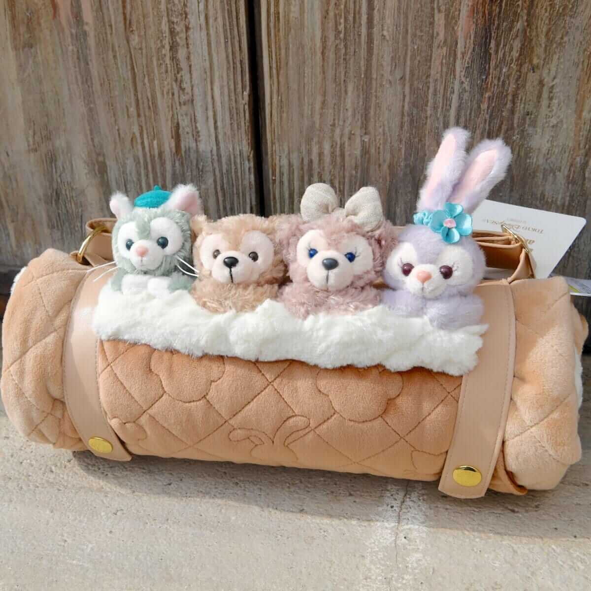 ダッフィー、シェリーメイ、ジェラトーニ、ステラ・ルーがポケットに入っているようなデザインがかわいいふわふわブランケット。