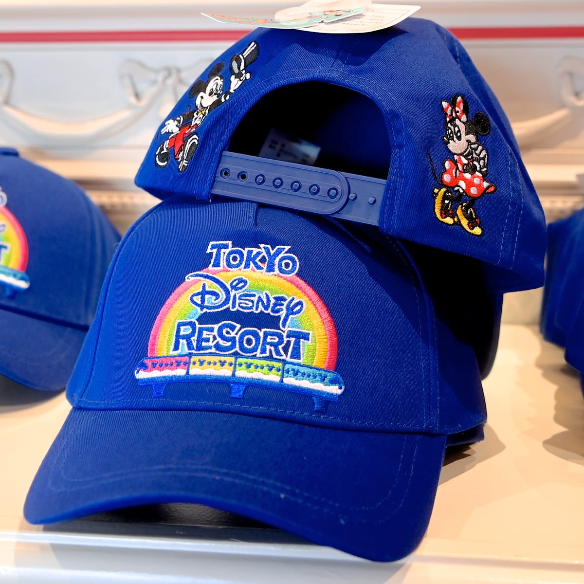 東京ディズニーリゾートのロゴ、ディズニーリゾートライナー、虹、ミッキーマウス、ミニーマウスが刺繍されたブルーのキャップ。