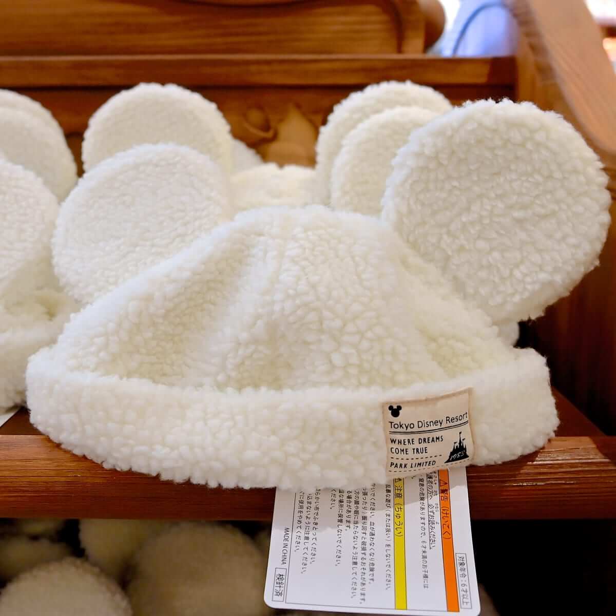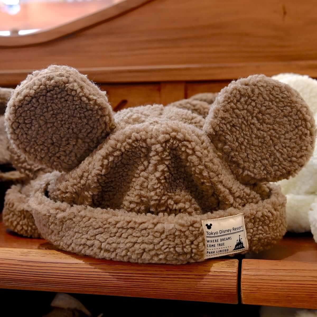 ツバのない丸い形が特徴の帽子にミッキーのお耳がデザインされたボアキャップ☆