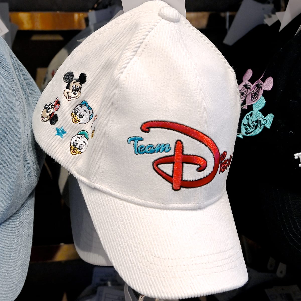 前面にチームディズニーのロゴ、サイドにミッキー&フレンズのお顔刺繍がデザインされたホワイトキャップ。