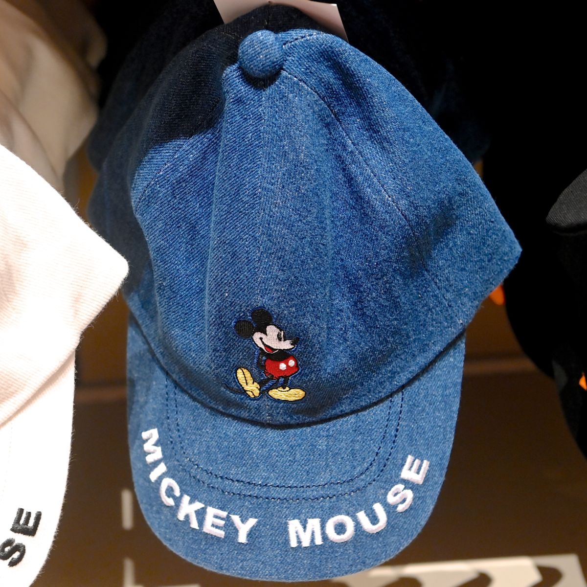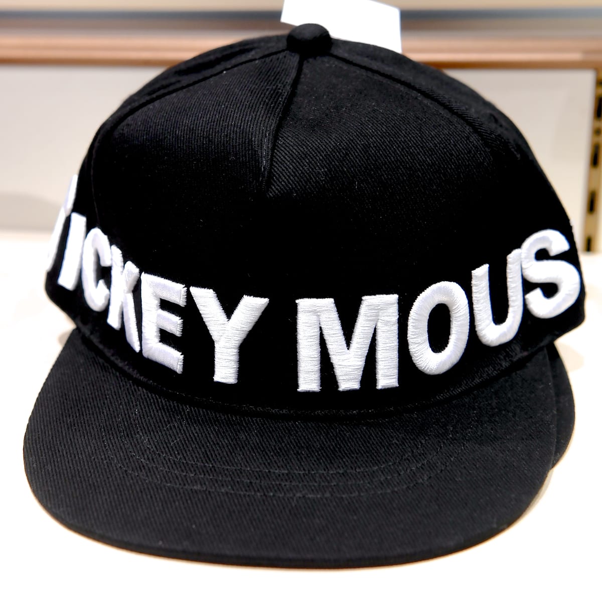 MICKEY MOUSEの名前刺繍が大きく施されたキャップ。