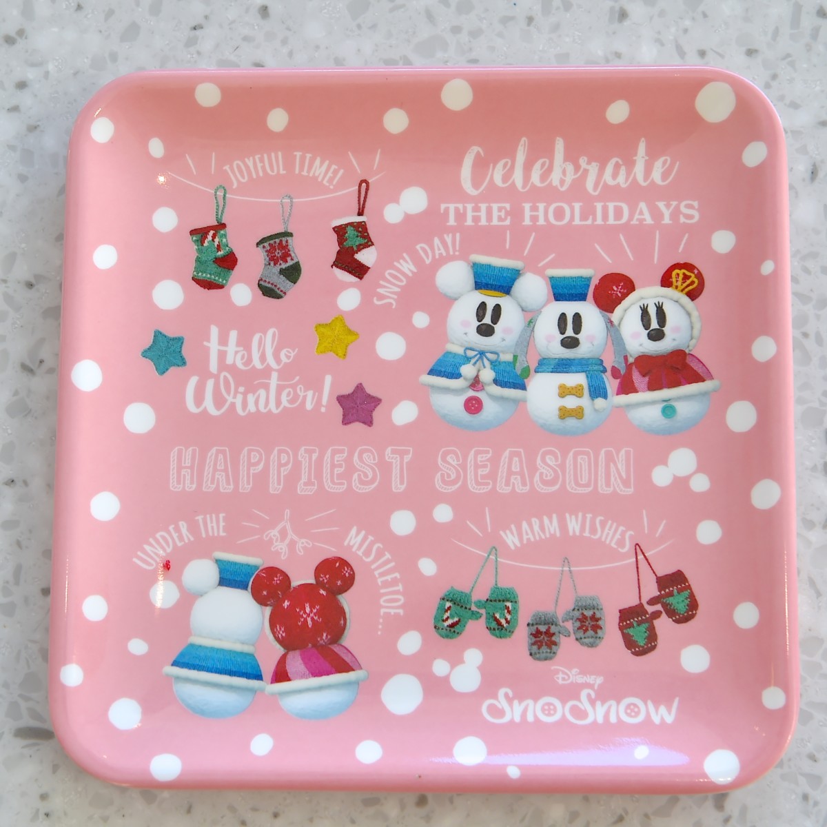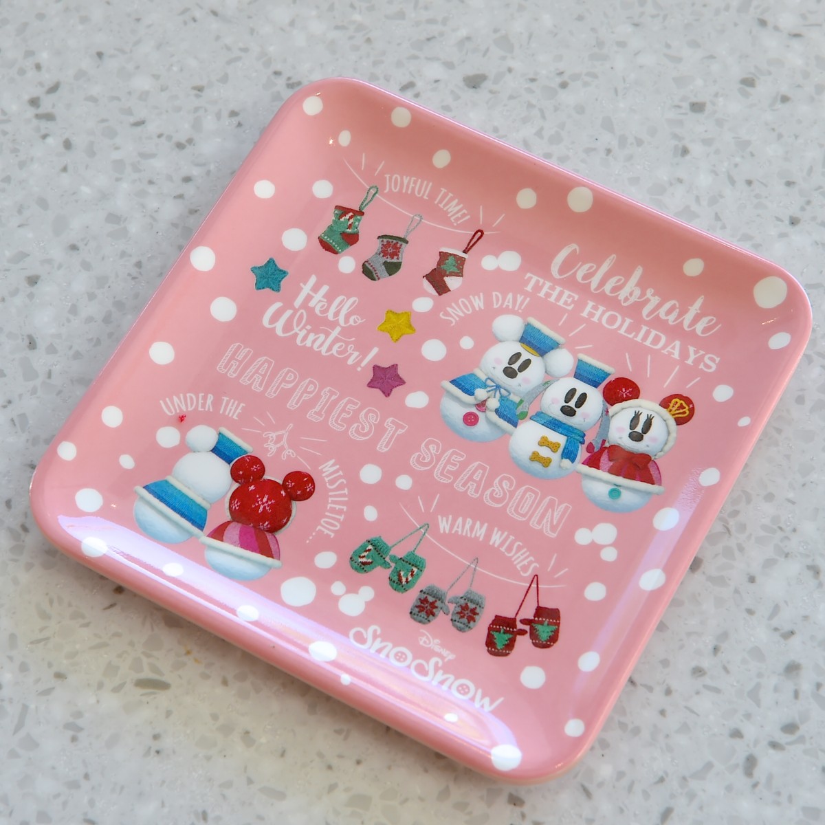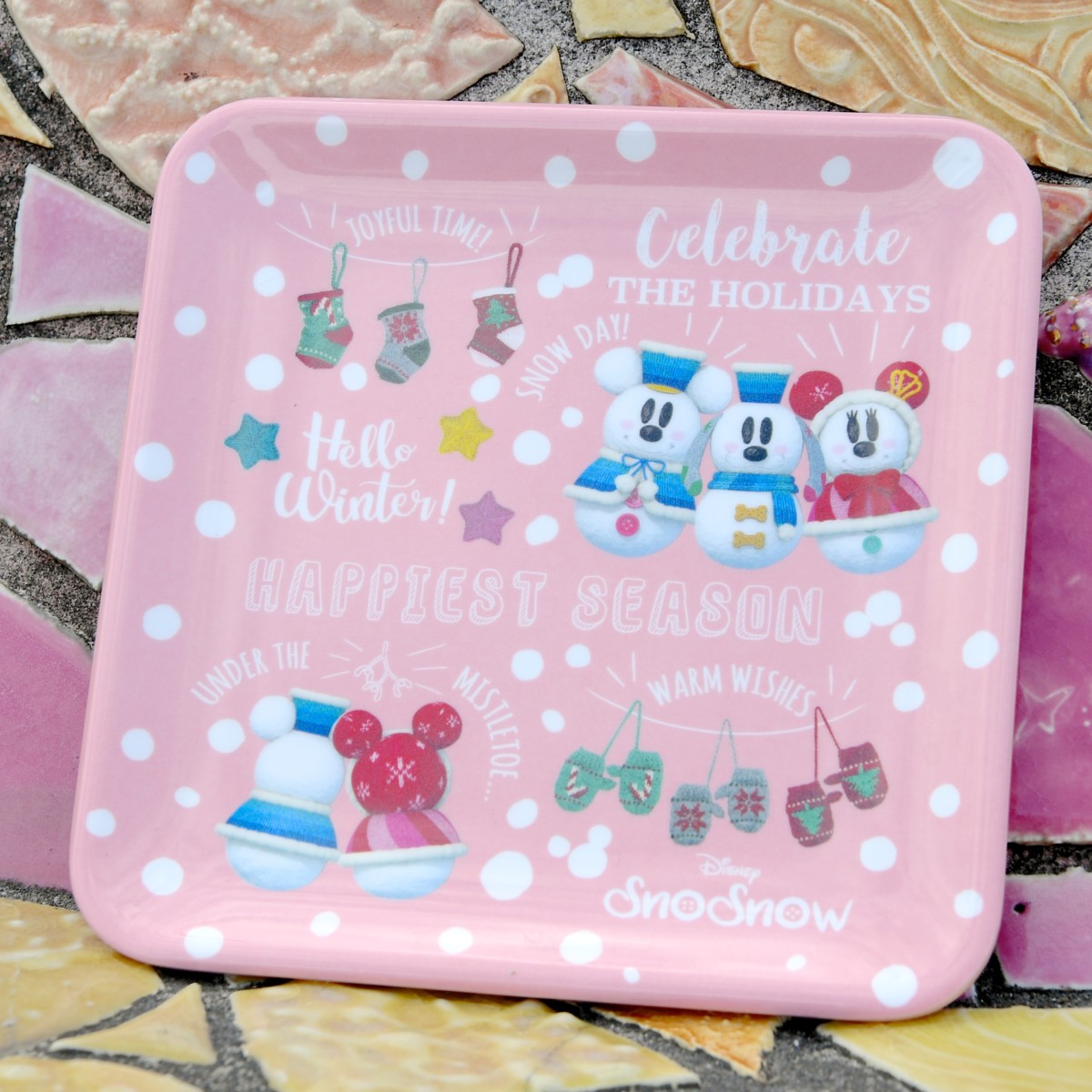 「スノーミッキー」、「スノーミニー」、「スノープルート」がデザインされたピンク色のかわいいスーベニアプレート。
