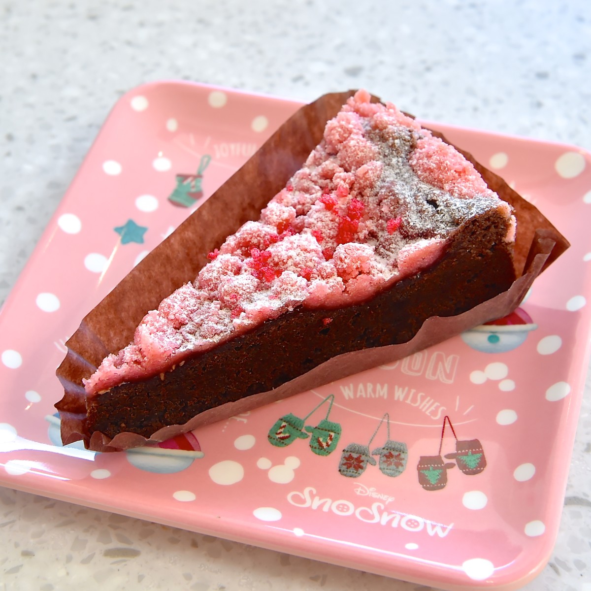 スノースノースーベニアプレート付き!東京ディズニーリゾート“ディズニー・クリスマス2018”チョコとラズベリーのクランブルケーキの紹介でした。