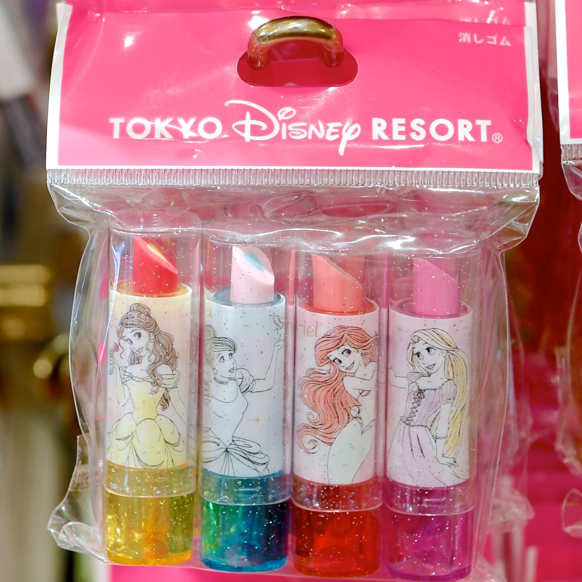 ベル、シンデレラ、アリエル、ラプンツェルがデザインされたキラキラかわいいリップ型の消しゴムセット。