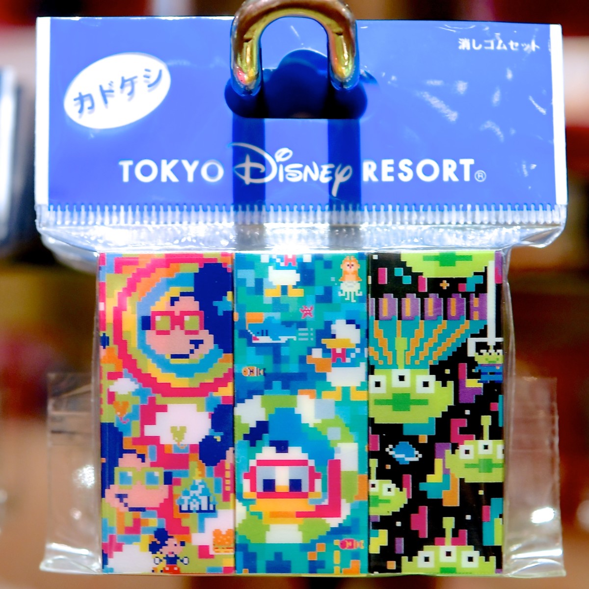 昔懐かしい8ビットデザインがかわいいミッキー、ドナルド&チップ&デール、リトルグリーンメンの消しゴム3個セット。