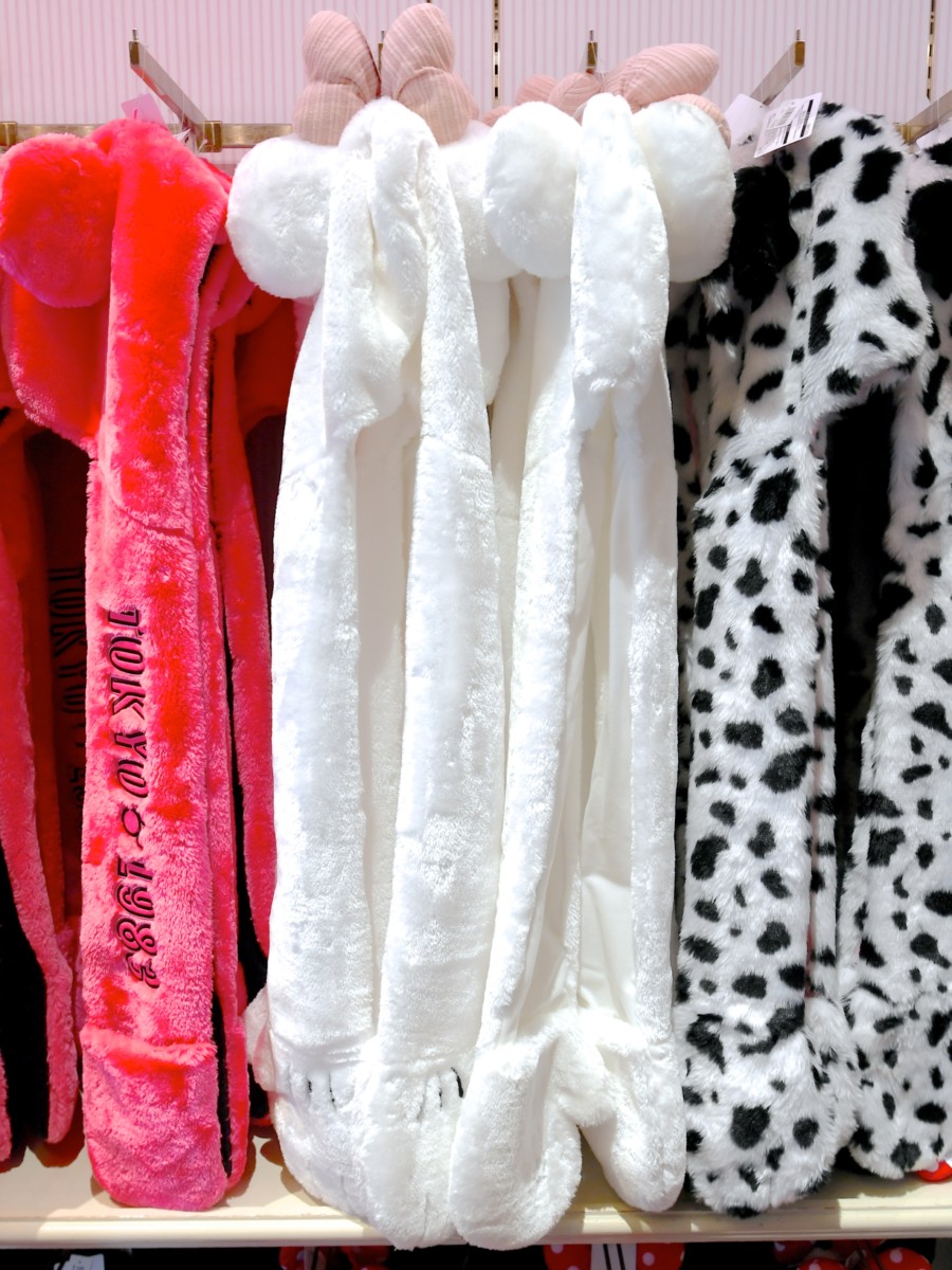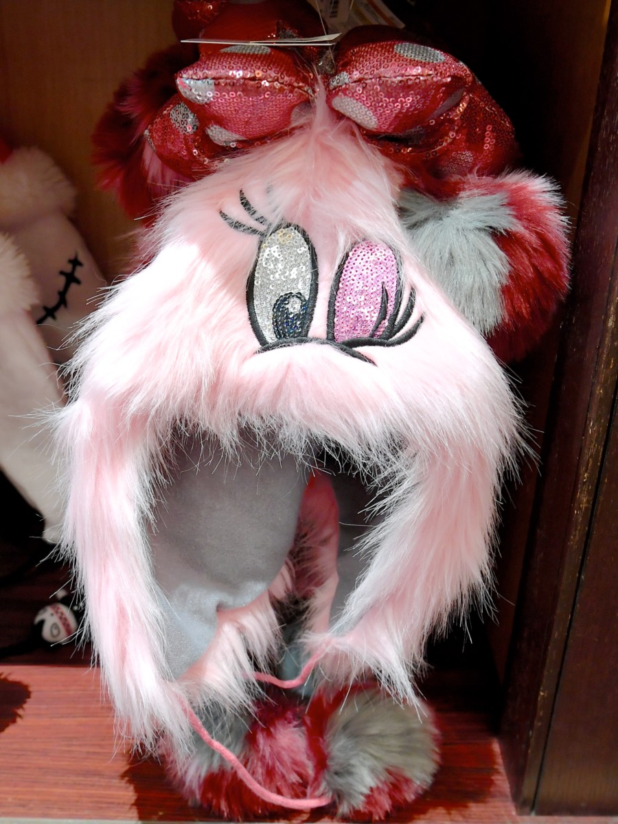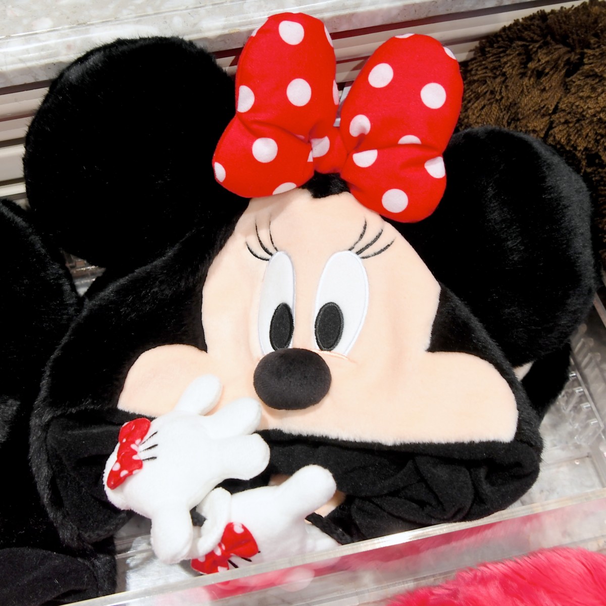 真っ白ふわふわなミニーちゃんのマフラー、ミトン付きファンキャップ。