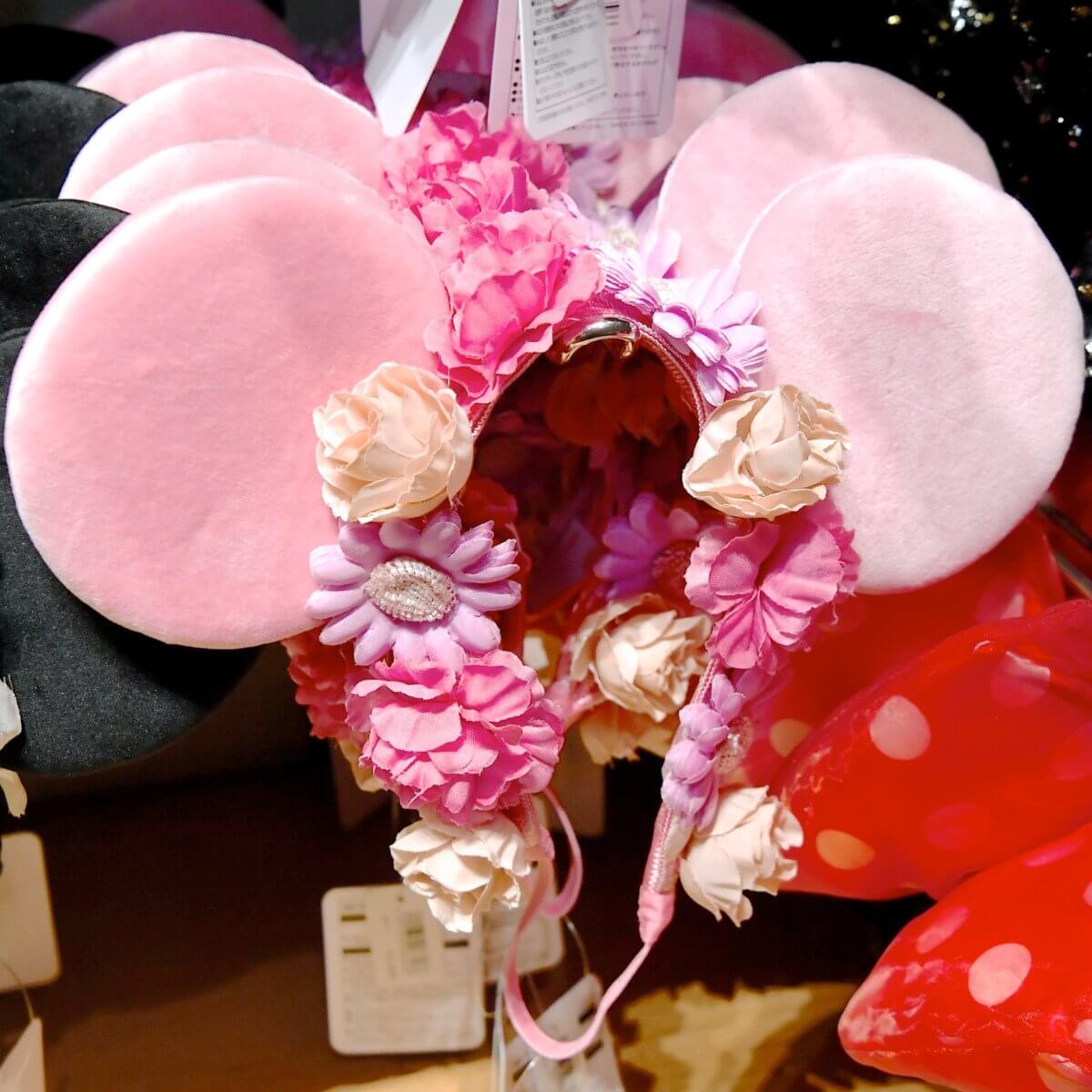 ピンクのお耳とピンクベースのお花がついたミニーマウスヘアバンド。
