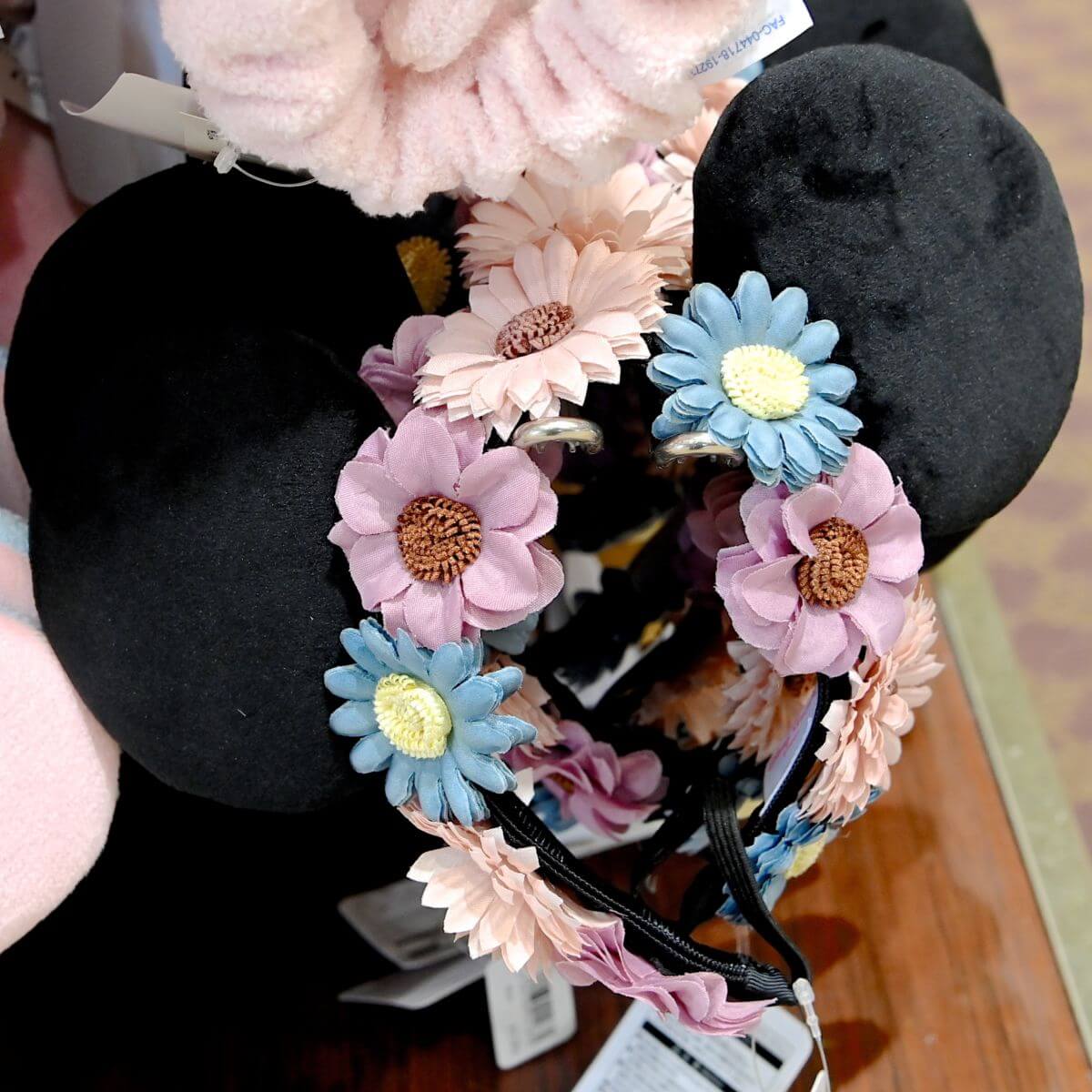 ピンク、ブルー、オレンジのパステルカラーのお花がデザインされたミニーマウスヘアバンド。