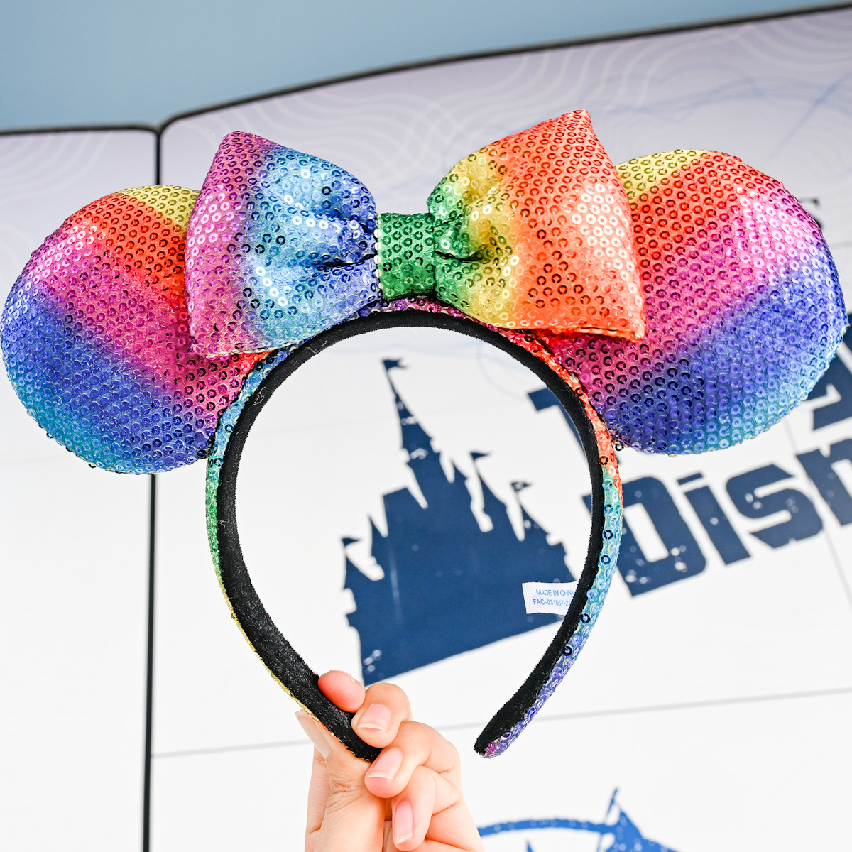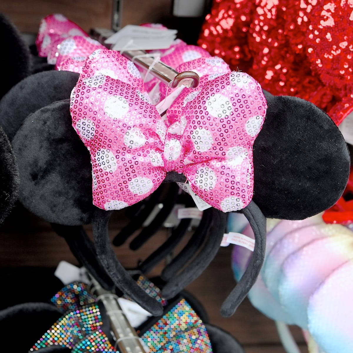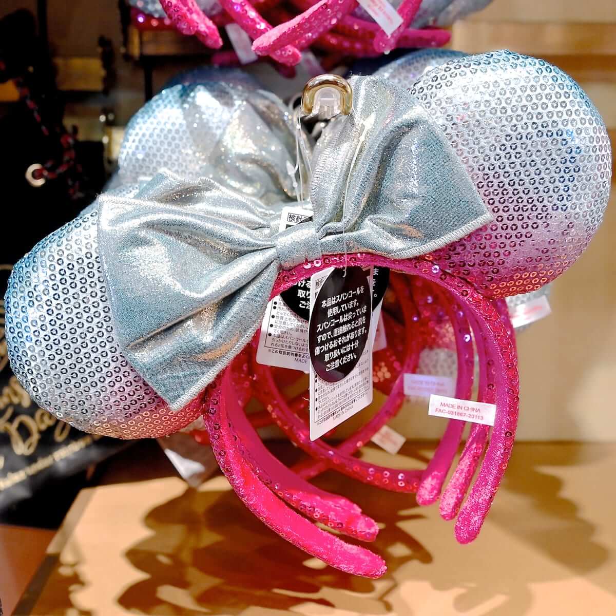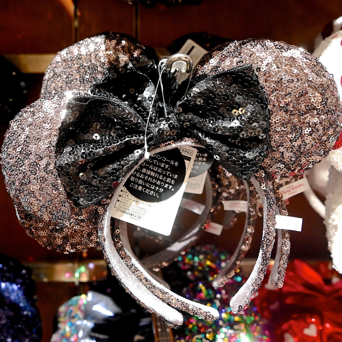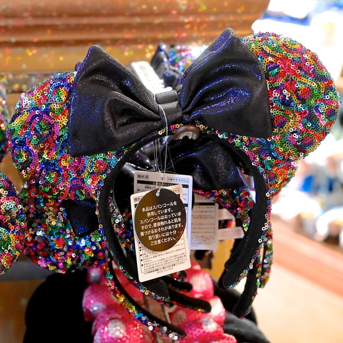 マルチカラーのお耳とブラックのリボンがオシャレなミニーマウススパンコールカチューシャ。
