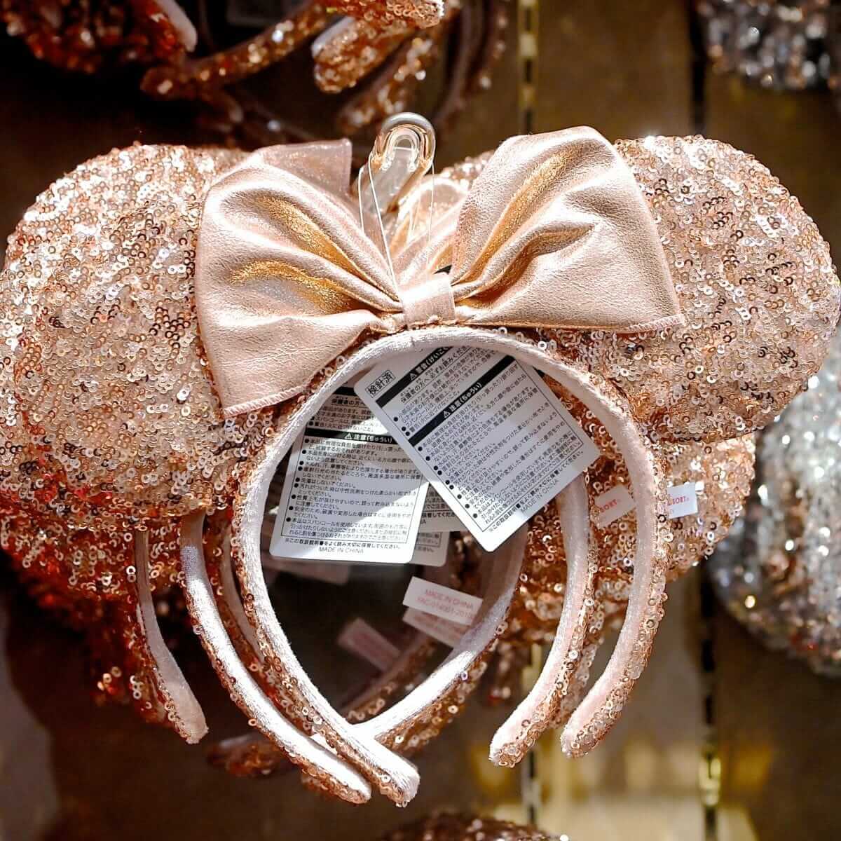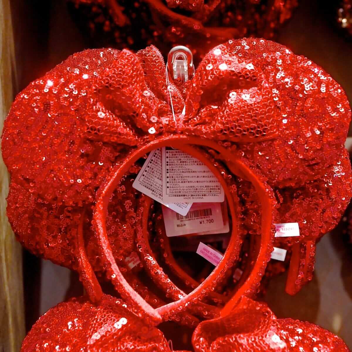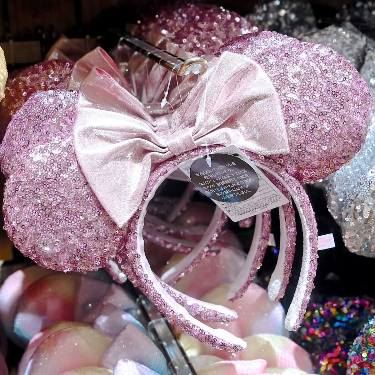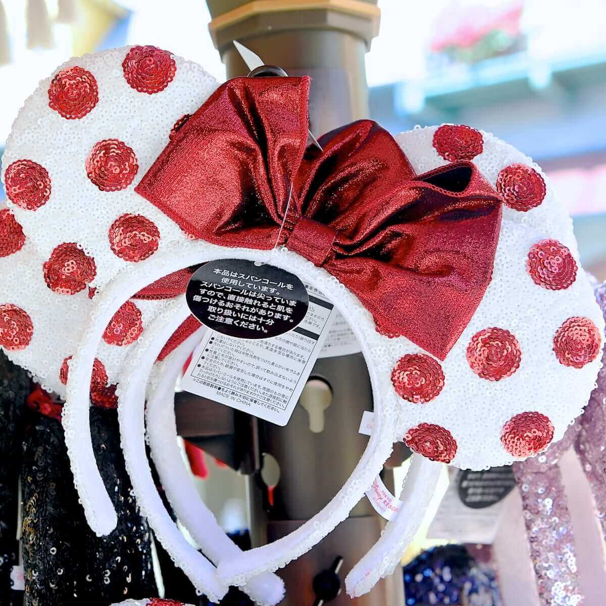 大きめのスパンコールがキラキラと輝く「ミニーマウス」のリボン付きイヤーカチューシャ。