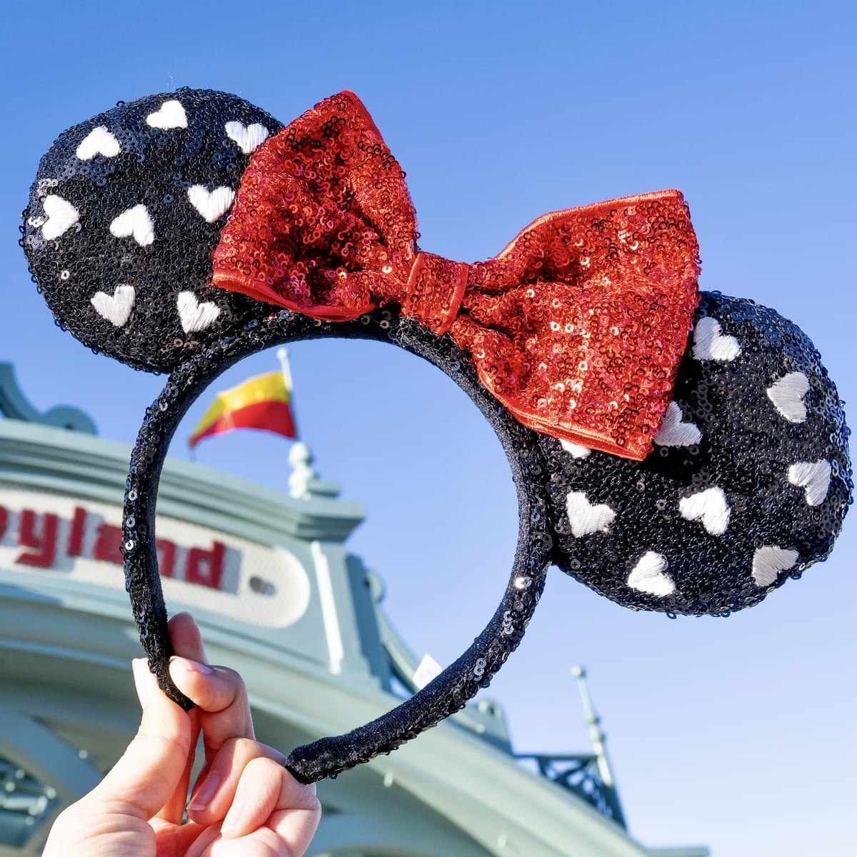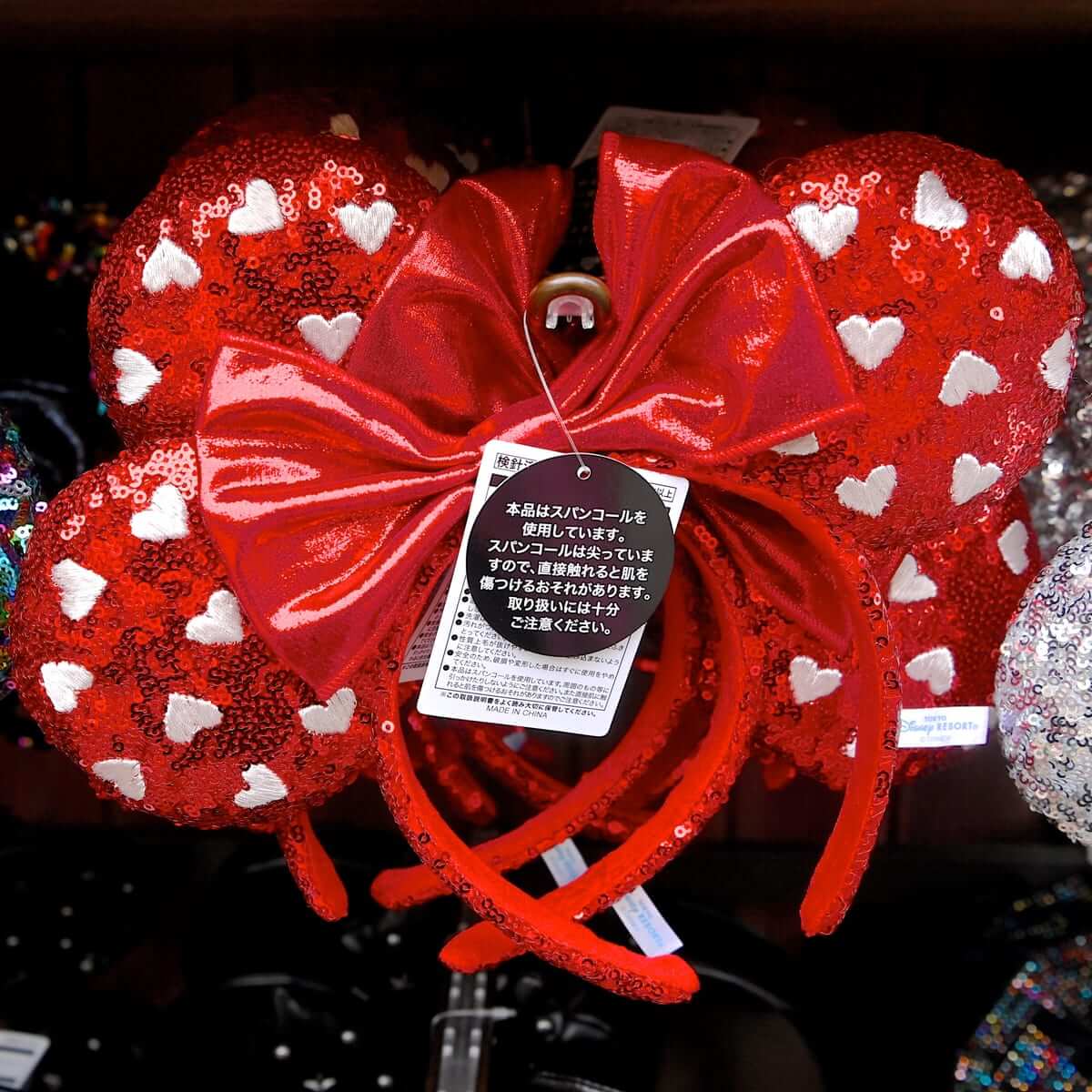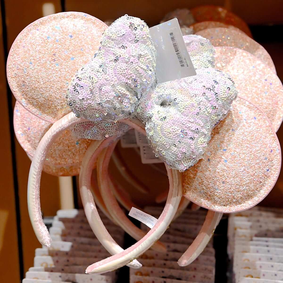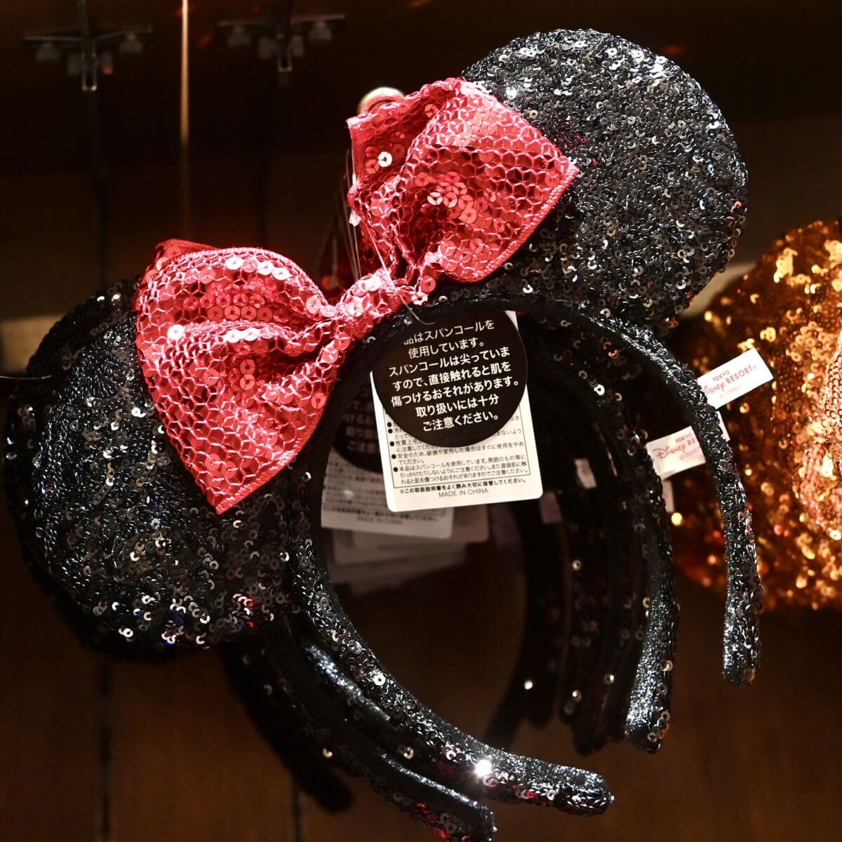 大きめのスパンコールがキラキラと輝く「ミニーマウス」のリボン付きイヤーカチューシャ。