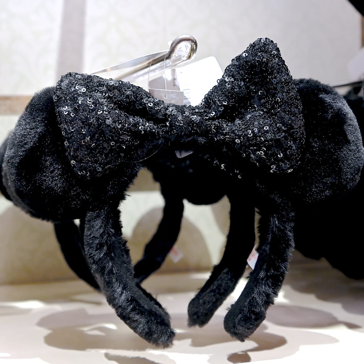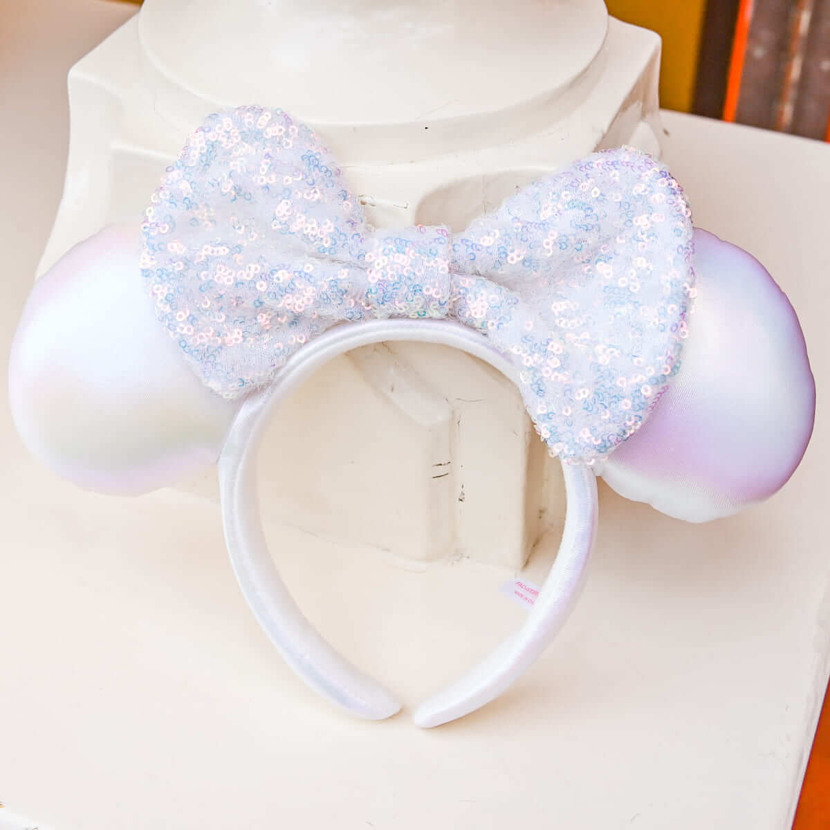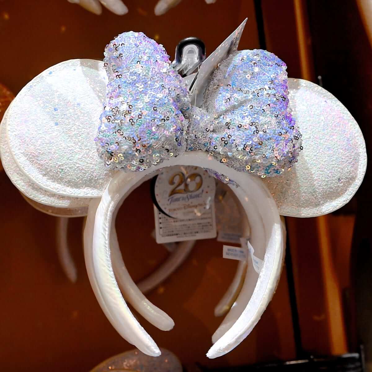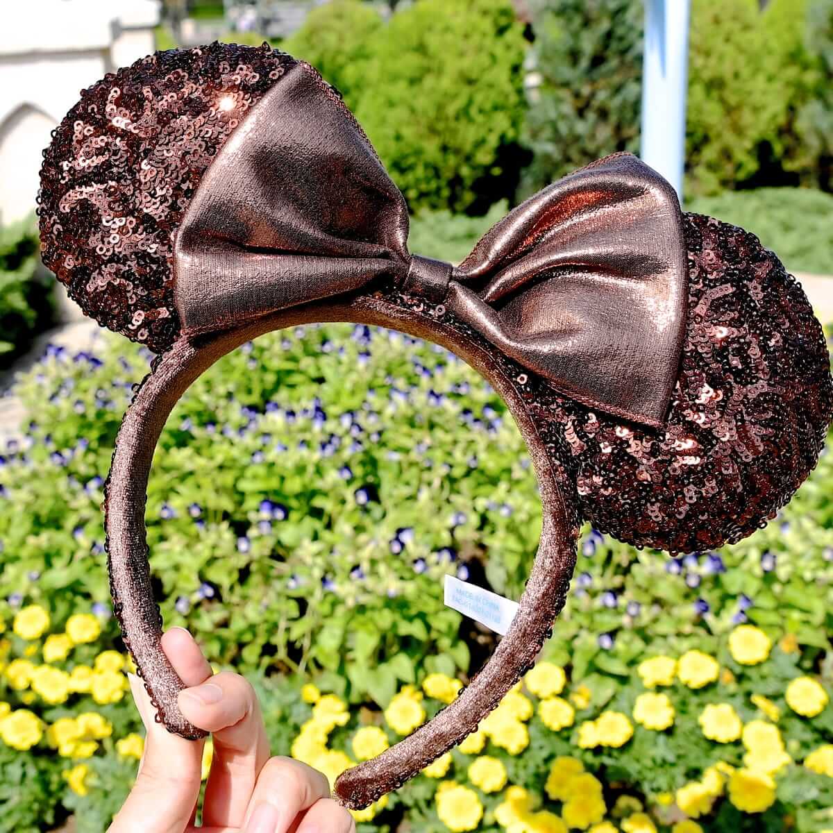 大きめのスパンコールがキラキラと輝く「ミニーマウス」のリボン付きイヤーカチューシャ。