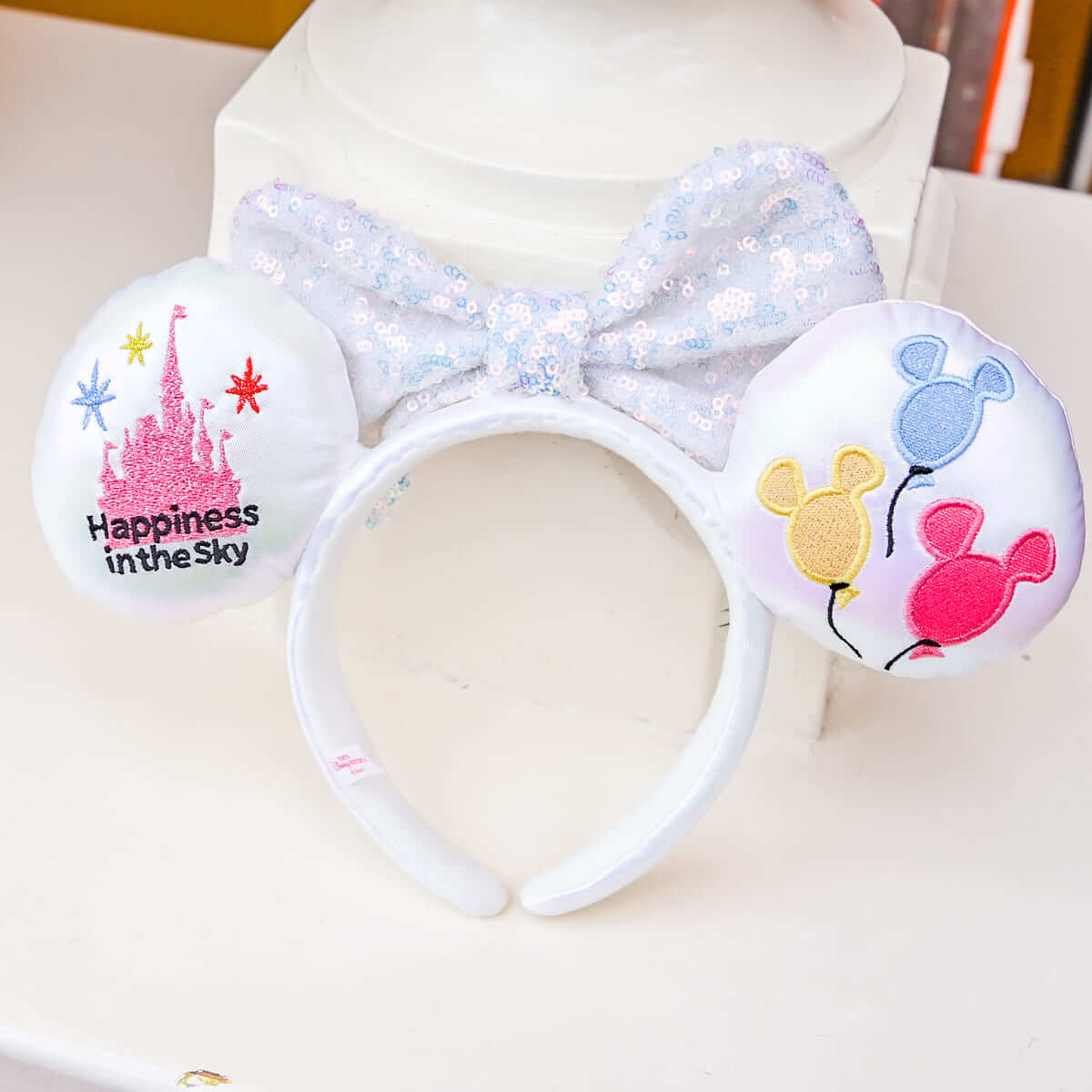 ミッキーバルーンとシンデレラ城がデザインされたホワイトカラーのミニーカチューシャ。