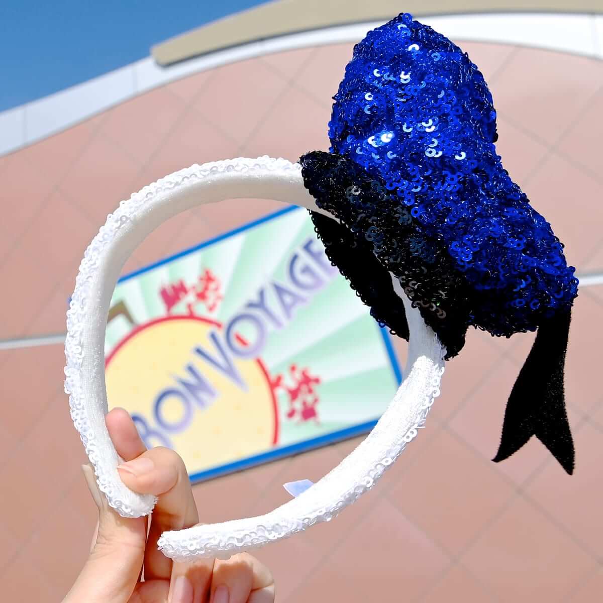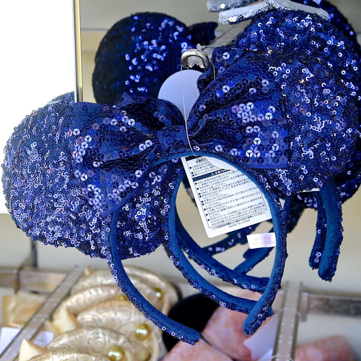 ネイビーカラーのあざやかなミニーのスパンコールカチューシャ。