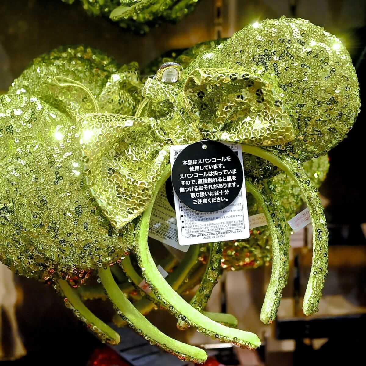 あざやかなイエローグリーンのミニーマウススパンコールカチューシャ。