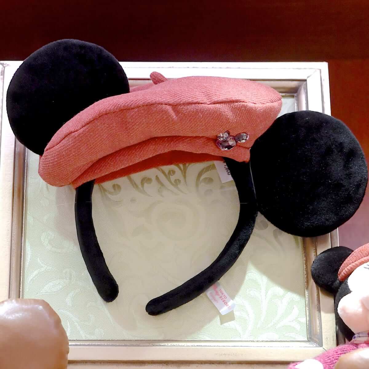 レトロ可愛い帽子とお花付きのミニーマウススパンコールカチューシャ。