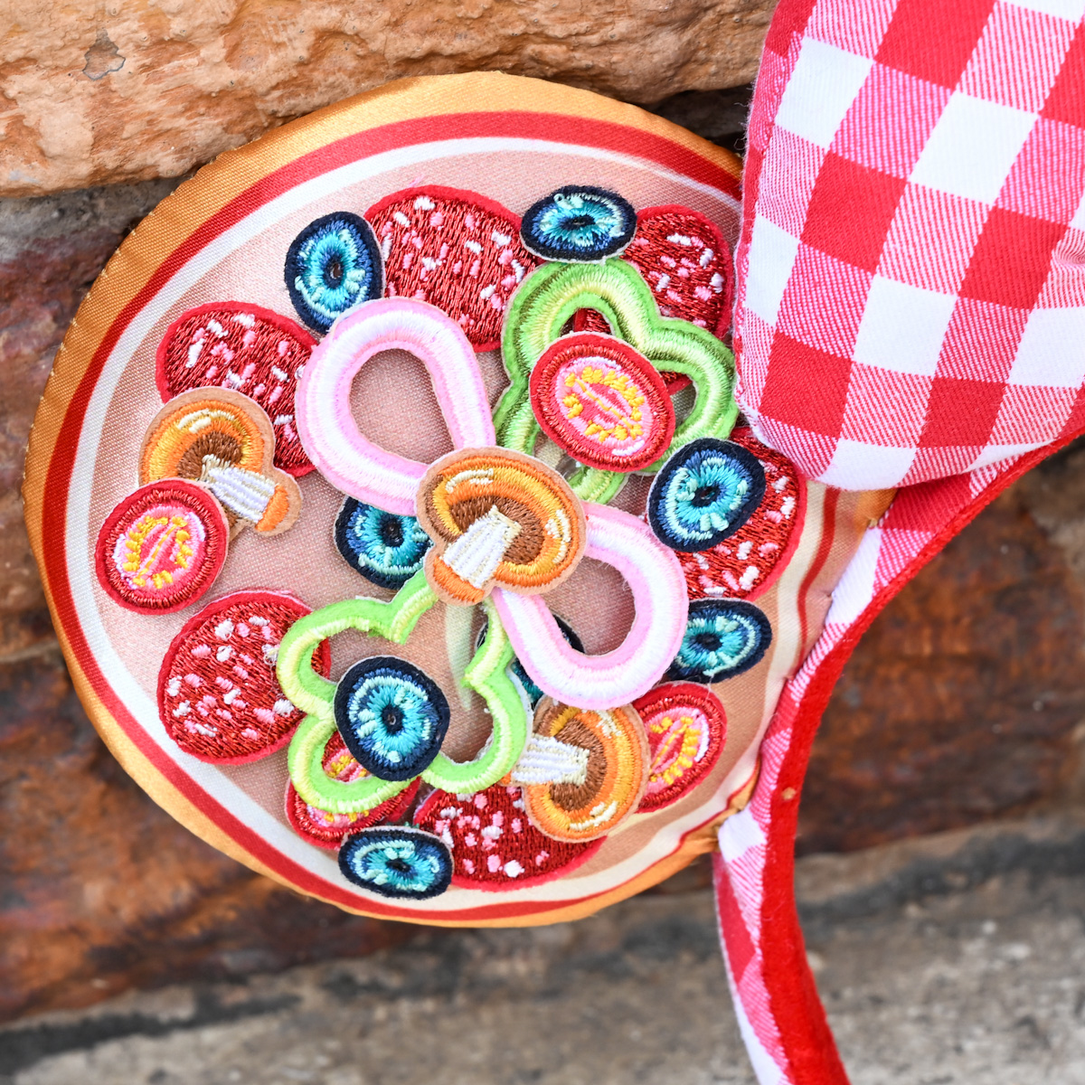 お耳部分に具だくさんなピザがデザインされています。