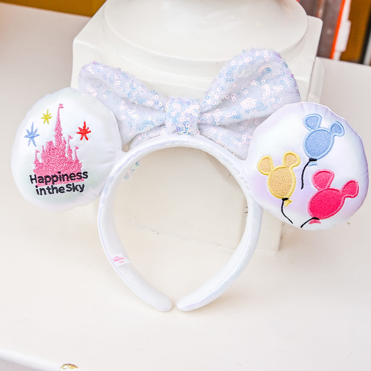 ミッキーバルーンとシンデレラ城がデザインされたホワイトカラーのカチューシャ。