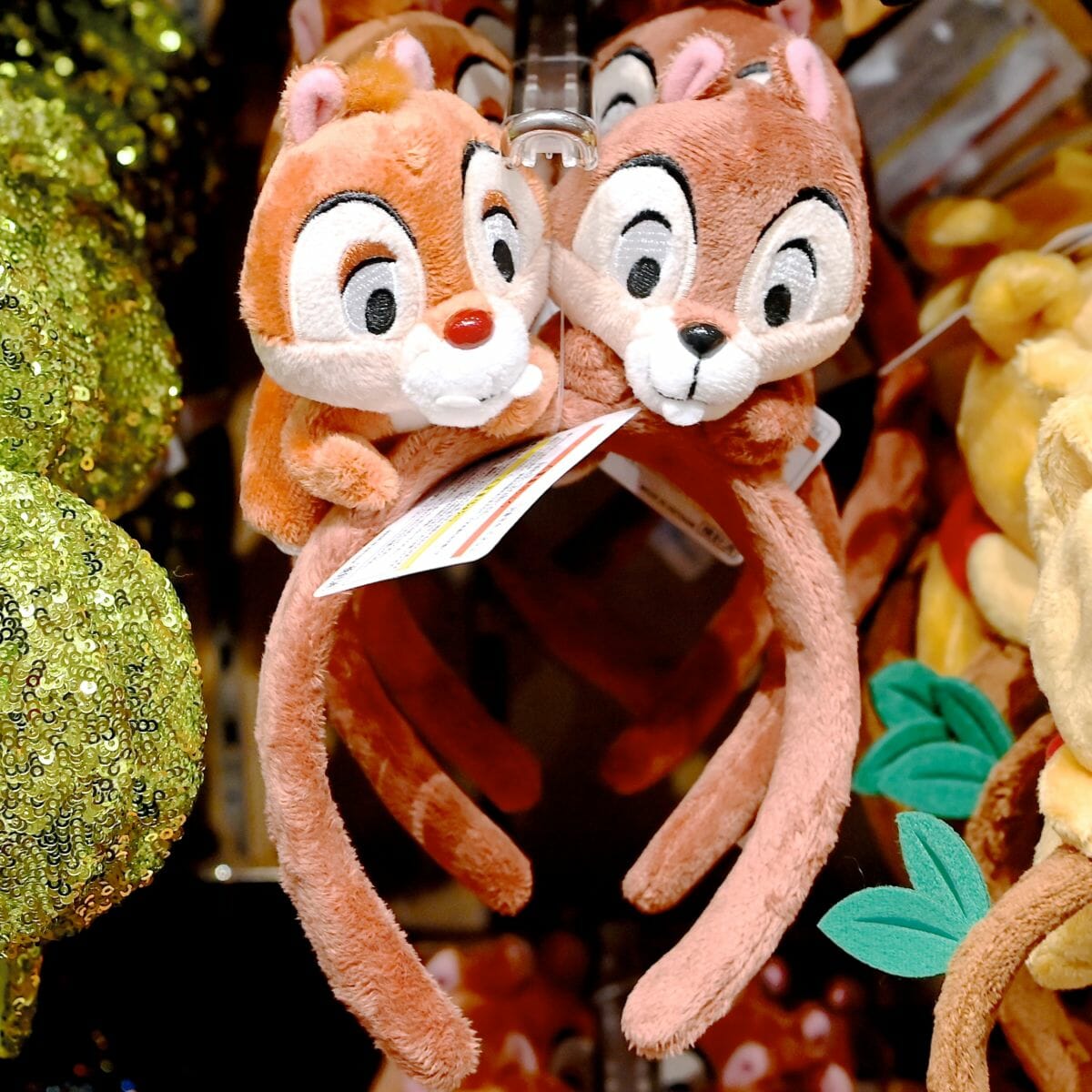 シマリスコンビのチップ(お鼻が黒色・歯が1本)とデール(お鼻が赤色・歯が2本)のぬいぐるみ付きカチューシャ。