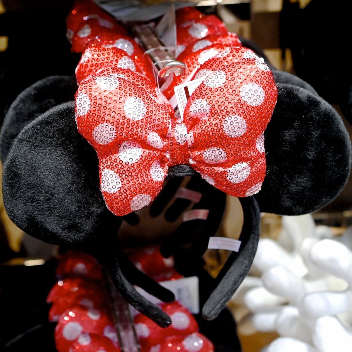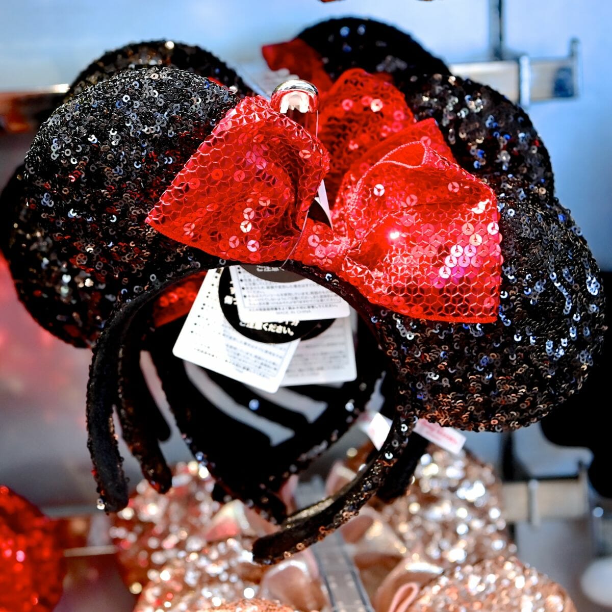 赤のスパンコールデザインリボンと黒いお耳のシンプルかわいいミニーマウスカチューシャ。