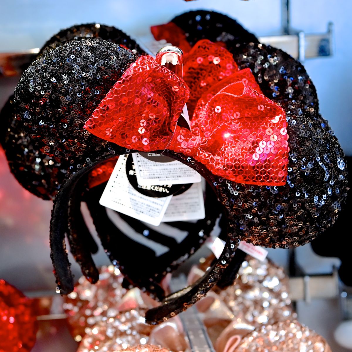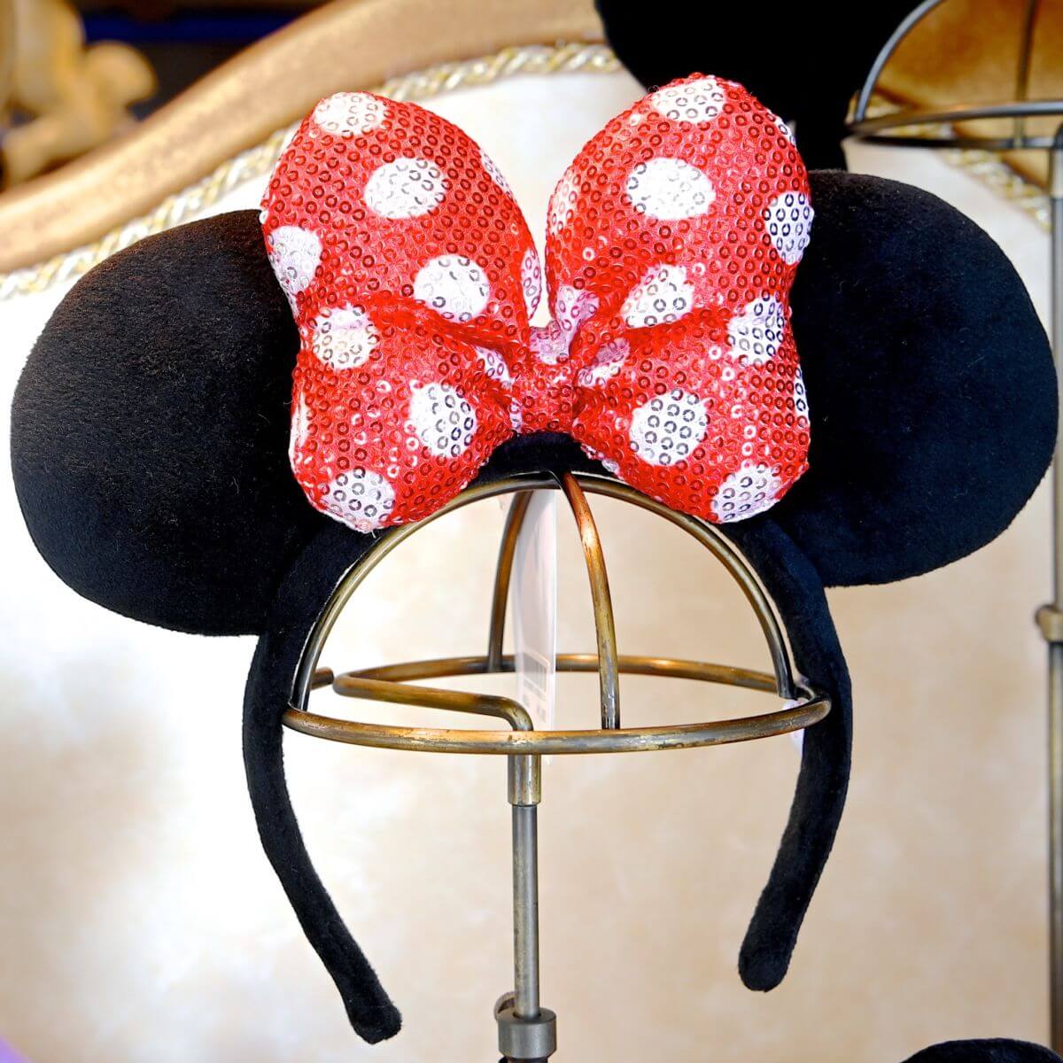 ミニーマウスのお耳、赤のスパンコールデザインリボンがシンプルかわいいカチューシャ。