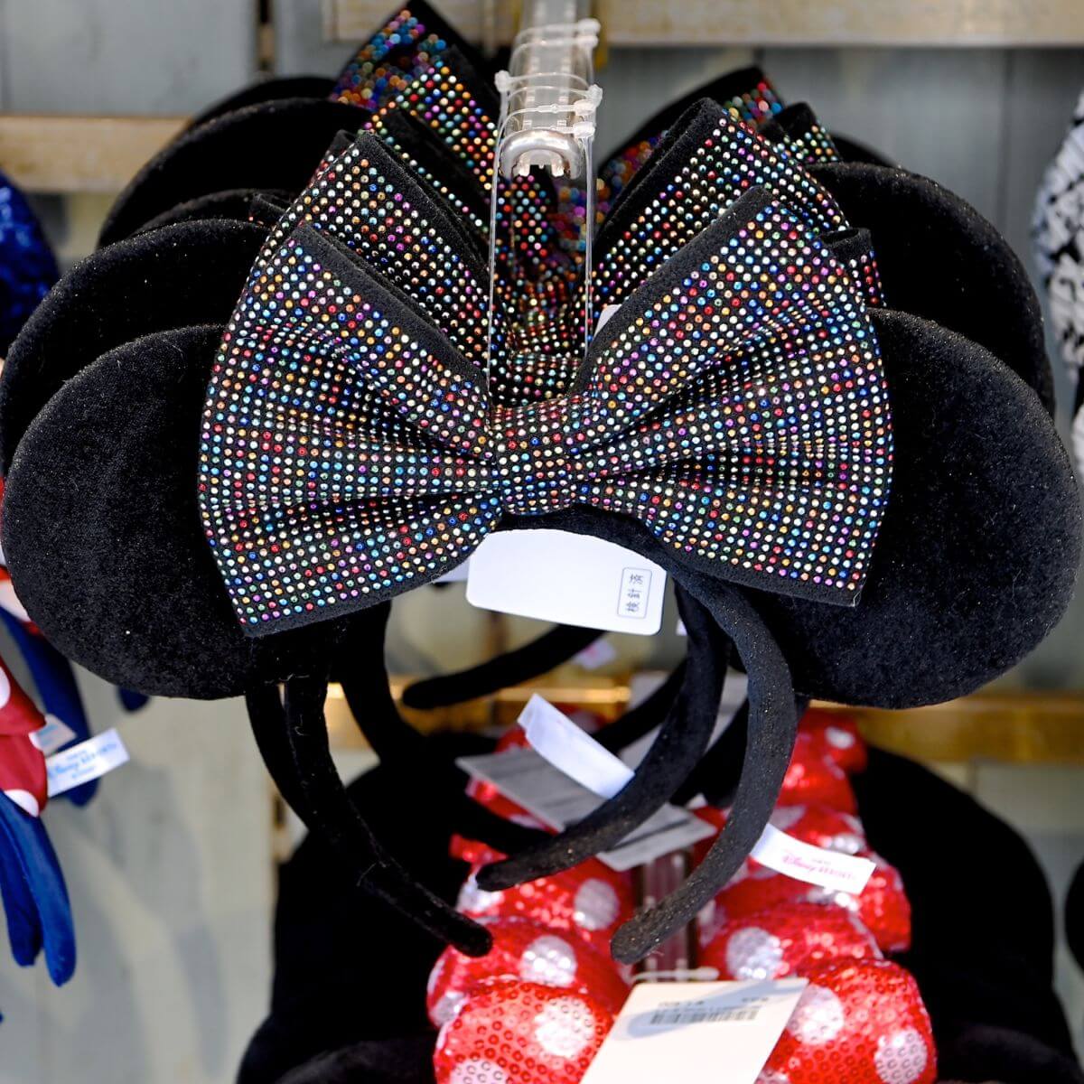 マルチカラーのキラキラリボンがついたミニーマウスカチューシャ。